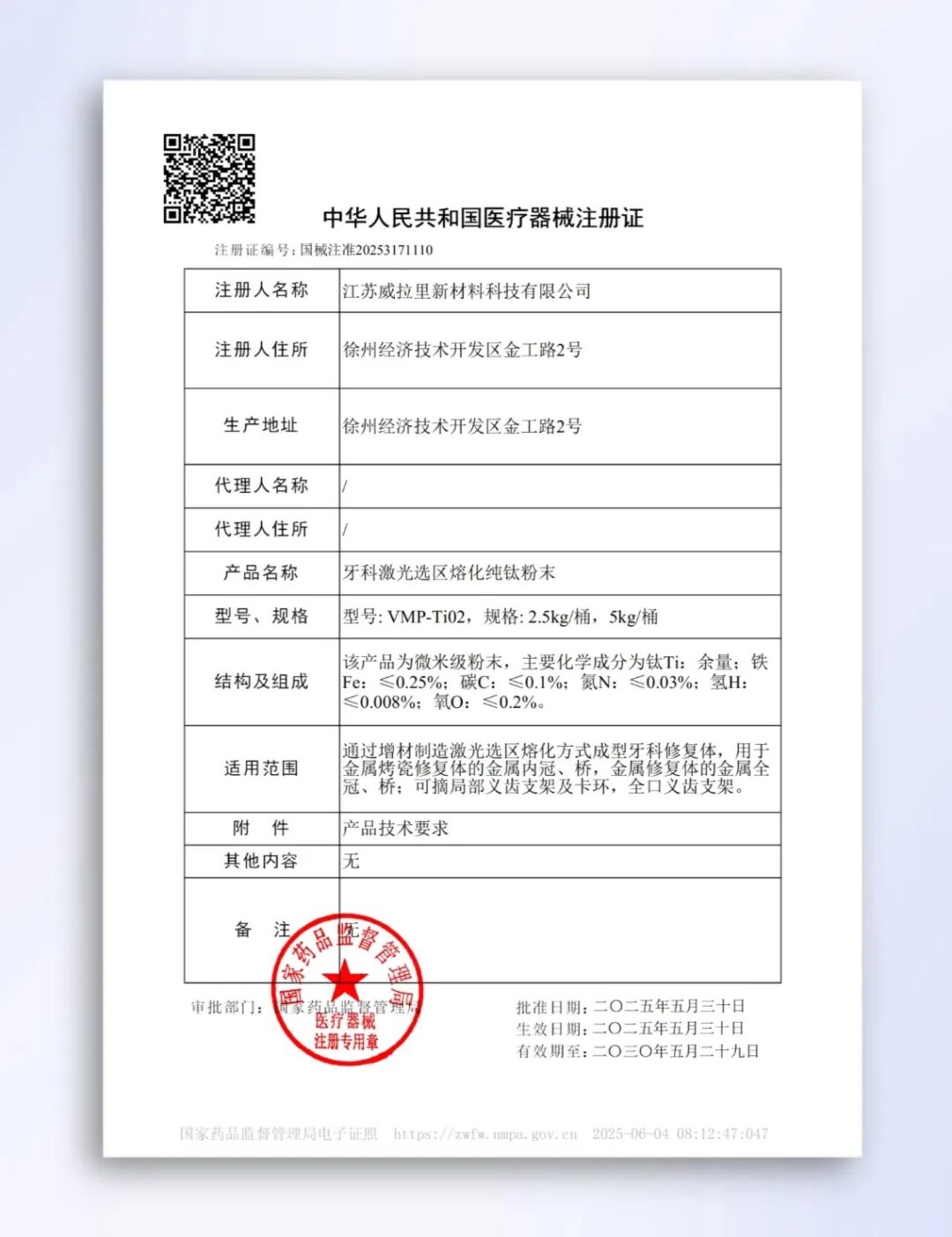 近日,威拉里公司自主研发的“牙科激光选区熔化纯钛粉末(VMP-Ti02)”正式获批第三类医疗器械注册证。至此,威拉里已完成VMP-CoCr01、VMP-CoCr02、VMP-Ti01、VMP-Ti02四款牙科专用金属粉末产品的第三类医疗器械注册布局,推动增材制造专用粉末在口腔医疗领域的应用发展。