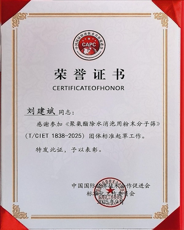 近日,由中国国际经济技术合作促进会标准化工作委员会主导制定的《聚氨酯除水消泡用粉末分子筛》(T/CIET 1838-2025)团体标准正式发布实施。江西鑫淘科技股份有限公司凭借在粉末分子筛领域的技术沉淀与行业影响力,受邀成为该标准起草单位,公司董事长刘建斌深度参与标准起草工作,为行业标准化建设贡献核心力量。