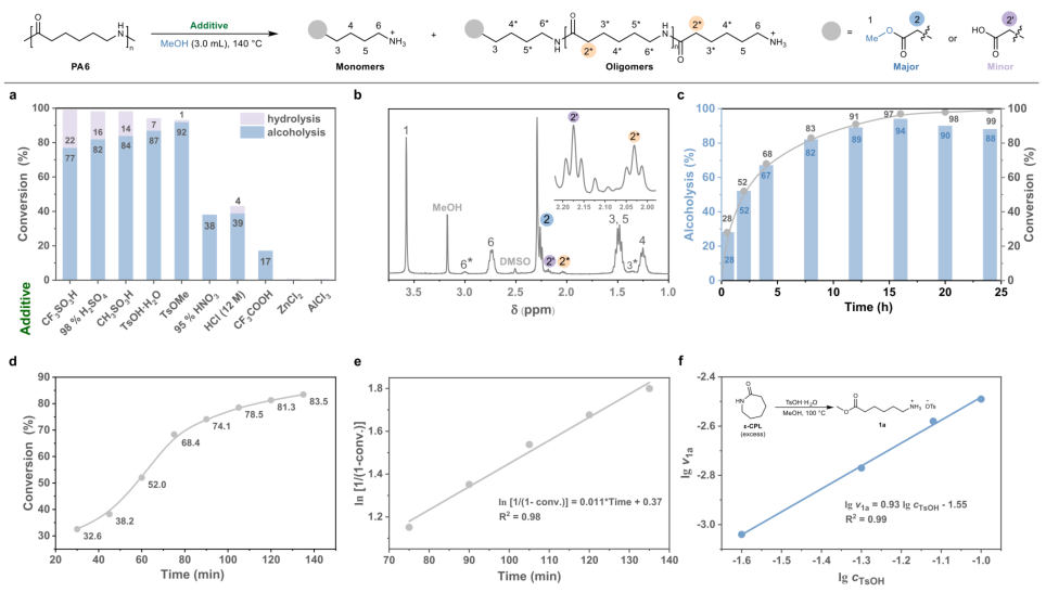 图2 | PA6醇解的添加剂筛选与动力学研究。 a PA6甲醇解的添加剂筛选。 b 使用甲苯磺酸甲酯时反应混合物的核磁共振氢谱。 c 在140℃下使用1.05当量甲苯磺酸甲酯时PA6转化率与甲醇解程度随时间的变化曲线。 d 在过量对甲苯磺酸存在下PA6的降解曲线。 e PA6单元拟一级动力学拟合曲线。 f 以ε-己内酰胺为模型底物对甲苯磺酸进行初始速率动力学研究。