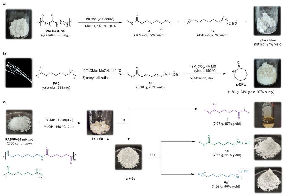 为实现闭环回收,团队还对降解产物进行了后续处理。氨基酸甲酯可通过中和反应转化为对应氨基酸酯,作为合成PA11和PA12的单体;而ε-己内酰胺的回收则通过氨基酯的分子内环化实现,在碱性条件下以高收率获得高纯度产物。此外,甲苯磺酸甲酯在使用后可以甲苯磺酸钾形式回收,并再生为活化剂,体现了该过程的可持续性。
