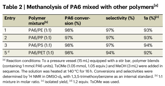 总之,本研究开发了一种在温和条件下高效解聚聚酰胺的新方法,不仅实现了单体的高收率回收,还成功应用于复杂废塑料混合体系,展现出良好的可扩展性与实用性。该工作为缓解白色污染、推动塑料循环经济发展提供了创新思路与技术支撑,有望在未来可持续聚合物回收策略中发挥重要作用。