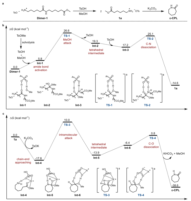 图5 | 理论计算。 a PA6模型二聚体的甲醇解与级联环化反应示意图。 b 二聚体甲醇解的DFT能量剖面图。 c 产物1a环化反应的DFT能量剖面图。