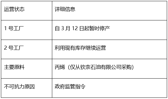 关于2号工厂的运营,公司将继续使用现有原料库存进行生产。任何需要单独披露的重大进展将根据适用法规向证券交易所披露。公司表示,目前尚无法估计此次持续的不可抗力事件可能造成的影响,并将密切关注事态发展。