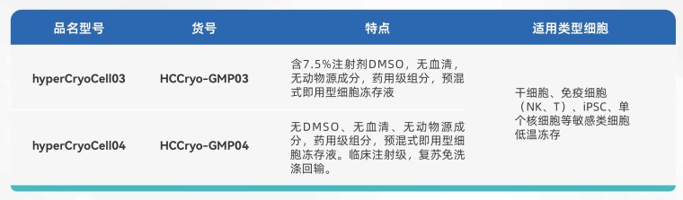 华辰生物hyperCryoCell™系列冻存液 hyper-CryoCell系列冻存液为干细胞、免疫细胞治疗用在超低温环境(-80℃与-196℃)保存用生物介质,是预先配置的即用型冷冻保护剂,系列产品均采用无血清技术配方,均采用临床注射级成分,配方优越,可支持细胞长期储存,安全稳定,复苏活率高。