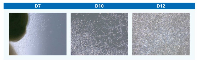 分离脐带华通氏胶组织,使用组织块贴壁法进行原代培养。每个T75培养瓶接种0.5g华通氏胶。37℃细胞培养箱培养1-2h后加入6-8ml细胞培养基。D2-D3补充培养基5ml,D7-D10天换液,弃去上清,加入新培养基10-15ml,D12-D14天观察细胞扩增情况,进行消化传代。 细胞最早爬出时间5-7天,镜下可以观察到少量零散细胞。 组织块贴壁效率高,贴壁的组织块多。 收获的细胞数更多。