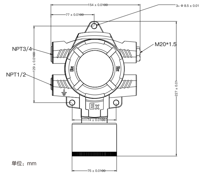 保时安 GTQ-DX401 多气体检测仪可同时检测可燃气、氧气、一氧化碳和硫化氢四种气体,具有高灵敏度、出色的重复性和便捷的维护特点,符合多项国家防爆标准。配备彩色液晶屏和人性化操作界面,实时显示气体浓度和状态,支持两级报警和RS485信号输出,确保工业环境下的安全监测。其防爆设计、超低功耗处理器、多重防护功能及模块化传感器更换,满足石油、化工等行业的高可靠性需求。 GTQ-DX401多气体检测仪(以下简称探测器)采用先进的集成电路技术、标准智能化技术设计的智能检测仪。探测器采用自然扩散方式进行气体采样,敏感元件采用优质的气体传感器模组进行气体检测,具有良好的灵敏度和出色的重复性,使用和维护方便,极大的满足了工业现场安全检测对设备高可靠性的要求。可广泛应用于石油、化工、环保、冶炼、炼化、农业、科研、高校等行业和领域。 本产品设计、制造、检定遵守以下国家标准: GB 12358-2006《作业场所环境气体检测报警仪通用技术要求》 GB/T 3836.1-2021《爆炸性环境第1部分:设备通用要求》 GB/T 3836.2-2021《爆炸性环境第2部分:由隔爆外壳“d”保护的设备》 GB/T 3836.31-2021《爆炸性环境第31部分:由防粉尘点燃外壳“t”保护的设备》 产品特点 1、人性化的GUI操作界面; 2、彩色液晶屏显示; 3、采用了先进的微功耗技术传感器; 4、具有LCD现场显示气体浓度的功能,使现场工作人员及时了解情况; 5、指示灯指示工作状态,正常、低报警、高报警,故障; 6、探测器外壳经过国家指定的防爆产品检验单位检验,并取得了防爆合格证。 产品功能 1、采用半导体纳米工艺超低功耗32位微处理器,24位ADC数据采集芯片; 2、同时检测可燃气、氧气、一氧化碳、硫化氢四种气体(也可根据需求自由定制); 3、PPM、%VOL、mg/m、μmol/mol,单位可切换; 4、现场带背光大屏多参数LCD显示,直观显示气体浓度、类型、单位、工作状态等; 5、更换传感器无须现场标定,传感器关键参数自动识别; 6、中英文显示; 7、传感器多达5级目标点校准功能,保证测量的准确性和线性; 8、两级报警设置,两组继电器无源信号输出; 9、标配RS485信号:采用标准MODBUS RTU协议,传输距离<1km; 10、具有过压保护、防雷保护、短路保护、反接保护、防静电干扰、防磁场干扰等功能并且具有自动恢复功能,防止发生任何外部原因、人为原因、自然灾害等造成探测器损坏; 外形结构