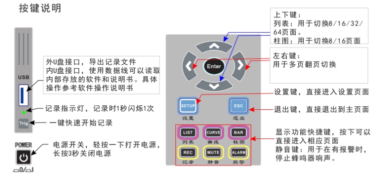 U盘接口 | 导出记录文件,也可读取内置记忆体存放的软件文件. |