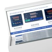 产品特点 1.1 台式节能 1.2 选件优良,构思独特:测温仪器重要的技术指标就是测温准确稳定,所选用的温度传感器均为德国进口的铂电阻,与之配合的是采用模糊控制理论和PID控制结合的LU-906M智能温度调节器,确保显示误差小于0.5%±1个字。 为了减少制冷系统噪音,选用专业的半导体制冷和大功率的稳压开关电源。仪器内附断水保护系统,一旦断水全机停电。 1.3超宽工组台:传统低膜梯度工作台只有三条涂料测试槽,由于其中一条放置已知试样(业已测定,作为对照之用),每次实验几个小时,只能测出两条未知样品。测试效率低,而QMB-II低膜有6个测试条,也就是说每次可同时测出5 个样品,即其测试效率提高2.5倍。