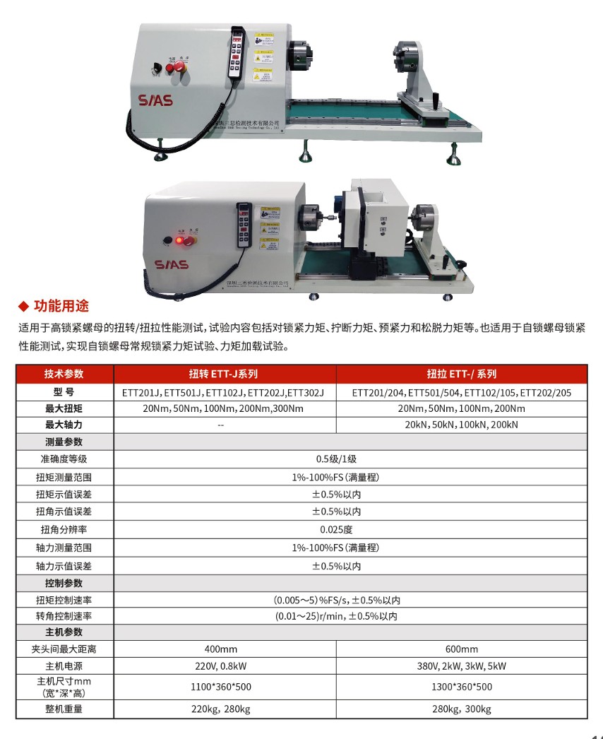 三思检测ETT-J紧固件扭转试验机适用于高锁紧螺母的拉扭性能测试,试验内容包括对锁紧力矩、拧断力矩、预紧力和松脱力矩等。也适用于自锁螺母锁紧性能测试,实现自锁螺母常规锁紧力矩试验、力矩加载试验。可求取总摩擦参数u总、螺纹摩擦参数u螺纹、端面摩擦系数u端面、拧紧系数K等参数。 三思检测ETT-J紧固件扭转试验机性能特点: 1.主要结构由扭矩装置、轴力卸载装置、定夹头组成。配置有轴力卸载装置,原理即在轴向加载力后,不转动螺母试样达到卸载轴向力; 2.紧固件扭转操作简单,控制精准;轴力卸载装置可以灵活移动,做试验时不需要轴力卸载装置,可以把该装置移动到主机后面;需要做高锁螺母试验时,把轴力卸载装置移动到两个三爪卡盘中间,再装夹试样; 3一次拧入拧出试验:将螺栓拧入至高锁螺母锁紧位置,安装后设置好相关参数,自动进行拧入拧出试验; 4.拧断力矩试验:将试验螺栓拧入至高锁螺母锁紧位置,然后安装在试验机上,设置好相关参数,开始试验,将高锁螺 母驱动部分拧断为止则试验完成,读取试验过程中拧断高锁螺母驱动部分时的力矩则为拧断力矩 5.锁紧力矩指拧入过程中的力矩,采值区域可设置; 6.预紧力试验:高锁螺母拧断时,试验机轴力通道显示的力值则为高锁螺母的预紧力: 7.松脱力试验:测试完预紧力后,通过不转动螺母的方式,去轴向载荷。然后夹紧螺母,转动螺母所需的力矩即为高锁螺母的松脱力矩。