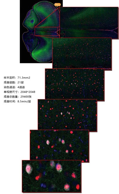 TissueFAXS Q+ 高分辨全景快速扫描系列,可以实现在组织学水平获得样本大批量高分辨全景图像,系统主要从全景成像角度,实现不同规格样本整体组织原位单细胞、特定组织功能区域、特定结构、空间相互作用位置的关系等整体大数据数据结果深度分析。 该系统主要以组织化学染色技术,结合高分辨全景扫描无缝拼接成像为基础,良好的解决了传统设备通常用于单视野内特定细胞亚结果或蛋白的成像弊端,无法提供整张玻片上细胞或特定结构的全景空间位置信息的问题。 小鼠脑全脑共聚焦成像(20x物镜) 用户评论 产品评分 目前评分共0人 产品质量