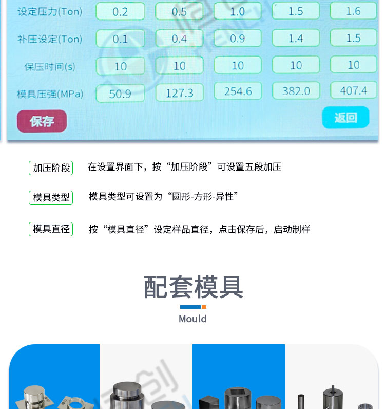 仪器型号 HAP-2S 压力范围 0.2-2T 油缸直径 Φ95mm 自动控制 采用Savta智能程序控制5段加压/可选配15段加压 加压方式 程序自动加压-自动补压-定时保压-自动泄压 保压时间 不限时(N秒) 压强换算 系统自动换算样品承受压强(超压提醒) 设备屏显 7寸 触摸液晶显示屏/中英文界面可切换 设备防护 10mm高强度氧化铝板+6mm有机玻璃防护门 限位保护 油缸超过限位高度自动泄压 主机保护 程序压力,机械压力故障报错急停功能 实际压强超过本机最 大压强自动启动泄压程序 数据管理 可存储1万条历史操作记录,并可导出U盘 油缸行程 ≤30mm 脱模压力 压力承载范围内可自行设置 被动安全 漏电保护+急停开关 智能操作 (选配)电脑连接进行远程操作/可根据客户需求定制 设备电源 220V(50Hz/60Hz)/可定制110V 设备功率 500W 有效空间 145×145×160mm 外形尺寸 230×395×432mm 设备重量 96Kg 配置说明 可根据用户需求定制或改进压片机,可选配承压范围内 各类圆形、方形、异形、电池模具等。