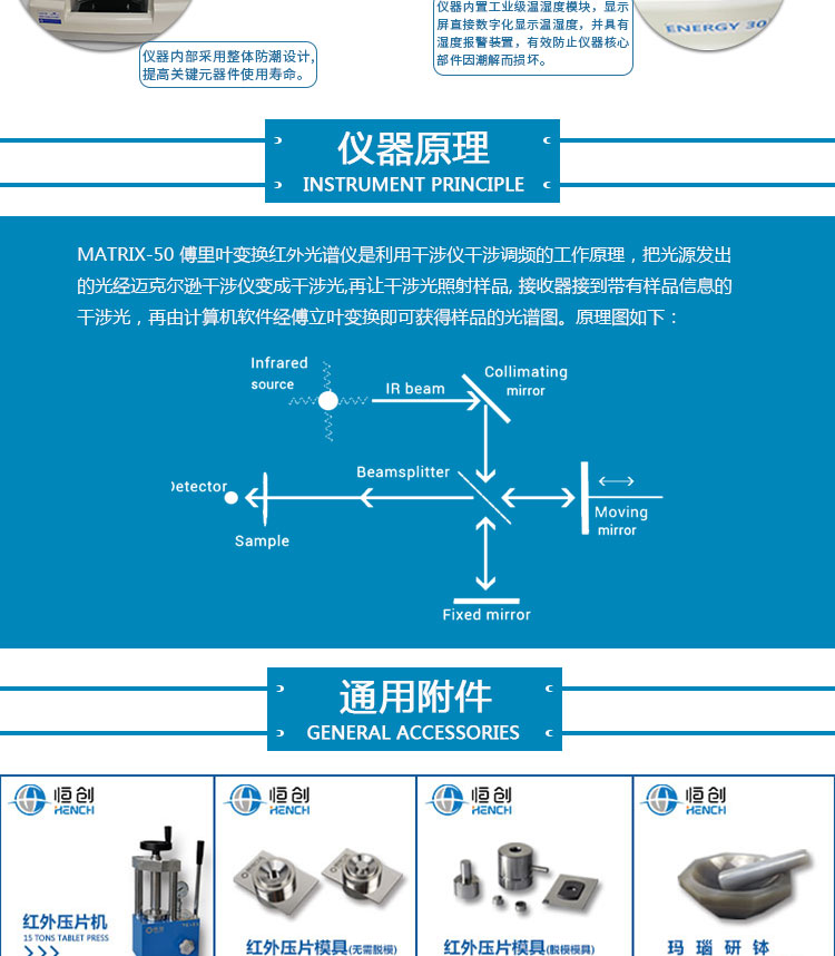 MATRIX 50型傅立叶变换红外光谱仪产品是天津恒创立达科技发展公司的结合机械、电子、AI等技术研制出来的先进仪器。该产品采用众多创新技术使得仪器的光源能量传输效率、干涉仪的稳定性、接收器的灵敏度都达到业内的先进水平。可以满足教学、工业及研究等各种级别的应用。 实验原理 利用干涉仪干涉调频的工作原理,把光源发出的光经迈克尔逊干涉仪变成干涉光,再让干涉光照射样品,接收器接收到带有样品信息的干涉光,再由计算机软件经傅立叶变换即可获得样品的光谱图。 **的光学系统设计 ² 干涉仪采用DSP控制电磁驱动Michelson干涉仪,具有连续动态调整功能,自动优化系统能量,无需人工调整; ² SuperTect数字技术的电子系统。全数字化,输出数字信号。24 位、500KHz 的 A/D 转换,高速 USB接口,达到光谱数据实时采集,保证了数据的真实性和可靠性; ² 仪器内置工业级温湿度模块,显示屏直接数字化显示温湿度,并具有湿度报警装置,而且腔体整体密封,保证整个腔体密封干燥,提高了防潮效果,大大提高各部件的使用寿命; ² 高能量红外光源,内置独特设计的反射镜,光源能量利用率远高于传统设计,可为傅立叶变换红外光谱仪的ATR及显微红外应用提供足够的能量。 ² 可重复使用的304不锈钢盒装干燥剂,无需开盖即可更换干燥剂。 ² 高频率稳定性He-Ne激光器和低功耗长寿命二极管激光器可选设计; ² 带电子稳压的24W碳化硅棒红外光源,采用数字供电技术,为光源提供稳定可靠的供电支持,并保证光源具有超长的使用寿命。 ² 动态准直技术:激光采用四象限探测准直技术,可以消除干涉仪动镜运动过程中产生的机械偏差,可以消除环境变换(重力、温度变化等)造成的光学误差; ² 采用非正交设计的Michelson改良型干涉仪,大大提高了能量利用率; ² 分束器,探测器,窗片等核心部件均为进口且镀有特殊的防雾化涂层,具有超高的透过率,同时还能降低湿气对溴化钾的腐蚀,也可选择KRS-5、ZnSe等可靠的防潮材料; ² 光学镜面设计:光学反射镜采用整体SPDT切削工艺,保证镜面高反射效率及光学系统一致性。 ² 扩展功能强大,可连接透射附件、衰减全反射附件(ATR附件)、漫反射附件、平面反射附件、外反射附件、红外显微镜等; 功能强大智能操作软件设计 1. 带有操作指引的智能人机交互设计,界面直观简洁,简单易学; 2. 丰富的谱图库,强大的自建库功能及高质量的谱图检索; 3. 实时显示数据采集,可以连续显示数据采集过程和谱图预览模式; 4. 操作软件包括基线校正,数据转换,多组分定量、曲线分峰拟合,H20/CO2自动补偿,吸光度透过率转换、 KK转换,标峰,四则运算,Y轴归一化功能,QC比较, 基础解析等功能;支持 CSV,SPA,DPT,TXT等等十几种格式;支持波数cm-1和波长um任意切换。 应用行业 珠宝鉴定 食品药品及其包装材料的测试 塑料、橡胶、尼龙、树脂等高分子材料的鉴定 沥青溯源及SBS含量测定 脂肪酸甲酯含量测定 矿物绝缘油、润滑油结构簇组成的测定 车用汽油中典型非常规添加物的识别与测定 硅晶体中碳氧含量的测量 纺织纤维鉴别 水晶Q值测定 建筑玻璃参数测定 … …