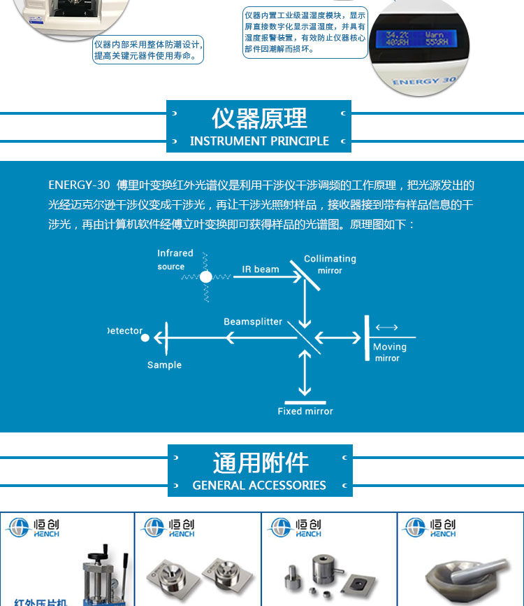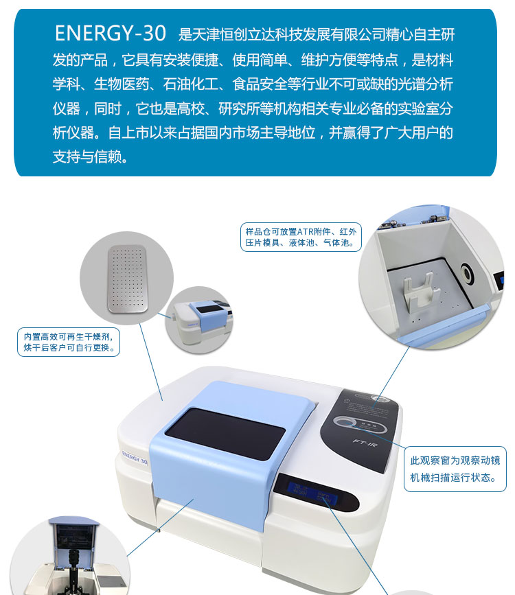 ENERGY 30傅立叶变换红外光谱仪是天津恒创立达科技发展公司精心自主研发的产品,它具有安装便捷、使用简单、维护方便等特点,是材料科学、生物医药、石油化工、食品安全等行业不可或缺的光谱分析仪器,同时,它也是高校、研究所等机构相关专业必备的实验室分析仪器。自上市以来占据国内市场主导地位,并赢得了广大用户的支持与信赖。 实验原理 利用干涉仪干涉调频的工作原理,把光源发出的光经迈克尔逊干涉仪变成干涉光,再让干涉光照射样品,接收器接收到带有样品信息的干涉光,再由计算机软件经傅立叶变换即可获得样品的光谱图。