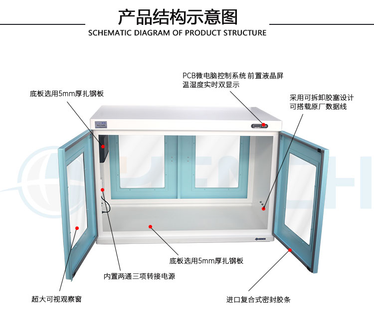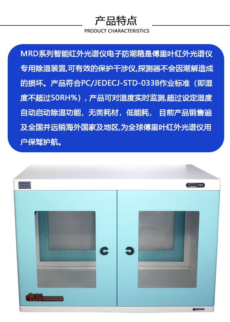 控湿范围:25RH%-50RH%,前置液晶屏温度/湿度双显示 按需定制:可根据客户设备场地需求定制产品规格开合方式:单开/上开/四开门等设计 线路设计:排线及供电线路隐藏保护设计,增加PCB电路板保护板。 除湿系统:智能湿度感应模块模组,采用可再生循环吸潮分子层膜,微电脑程控系统控湿,仓内湿度超过设置湿度档位系统将智能启动除湿,无耗材。 工作运行:断电具有吸湿防护功能,仍可运用化学吸湿补位功能继续除湿,24小时内温度上升幅度不超过10%