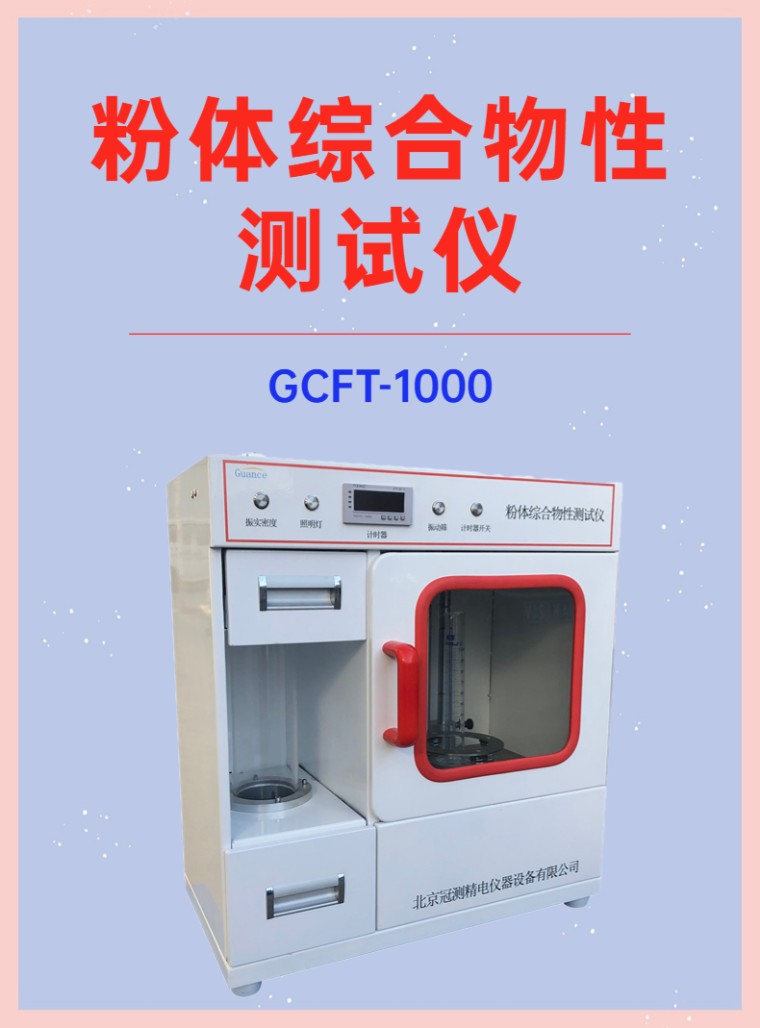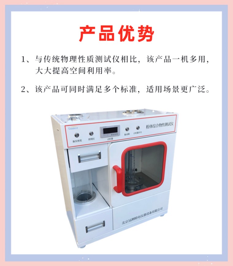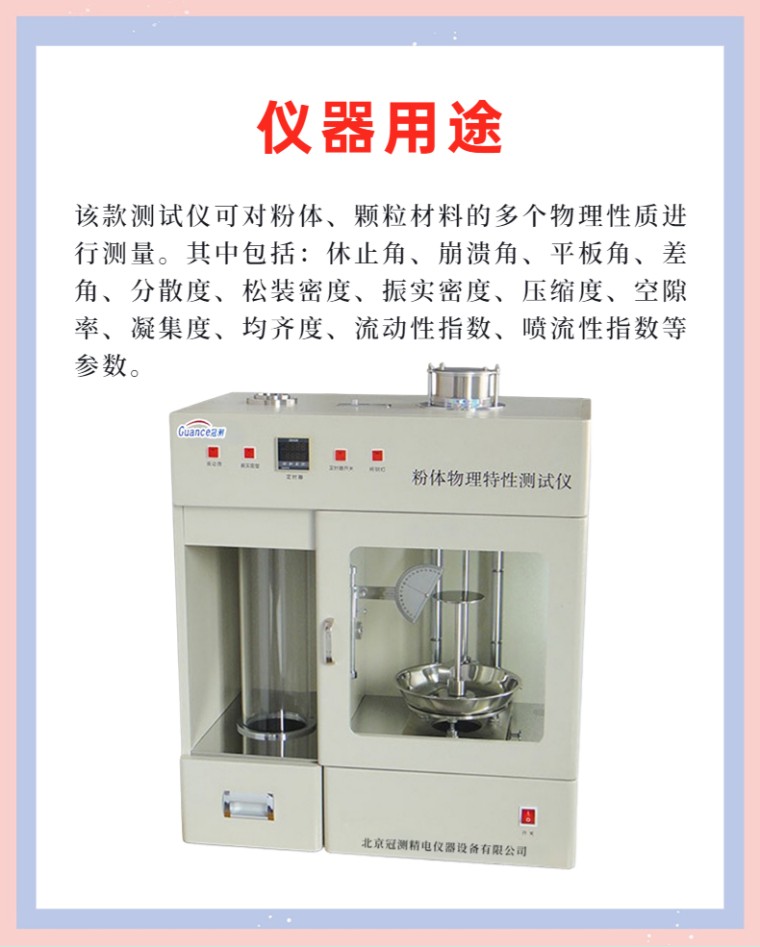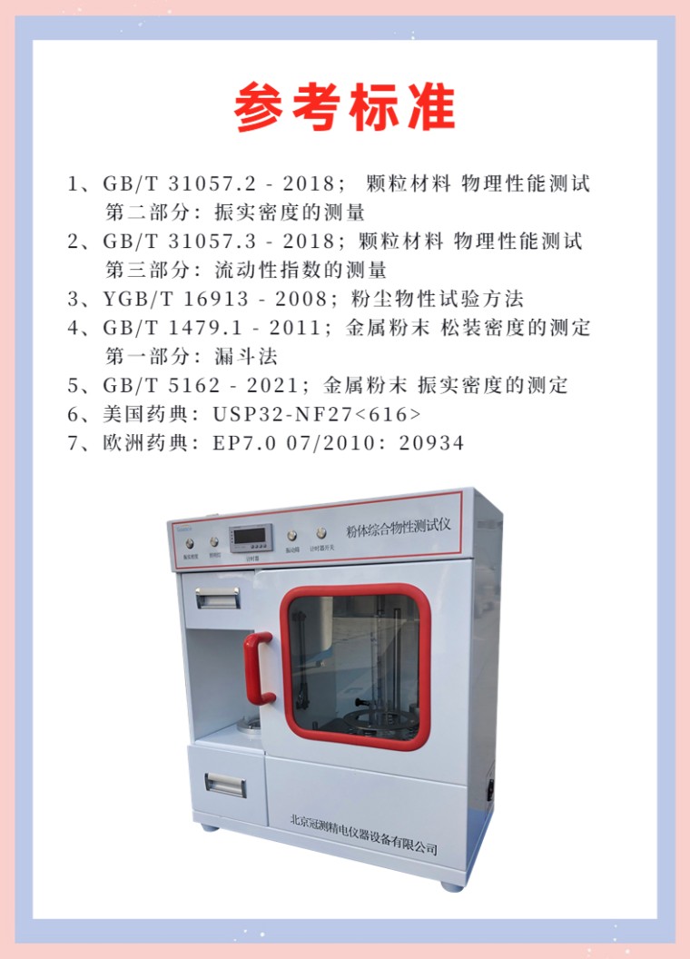 粉体综合物性测试仪 型号:GCFT-1000 一、参考标准: 1、GB/T 31057.2 - 2018; 颗粒材料 物理性能测试 **部分:振实密度的测量 2、GB/T 31057.3 - 2018;颗粒材料 物理性能测试 第三部分:流动性指数的测量 3、ASTM D6393 - 2014;Standard Test Method for Bulk Solids Characterization by Carr Indices 4、YGB/T 16913 - 2008;粉尘物性试验方法 5、GB/T 1479.1 - 2011;金属粉末 松装密度的测定 :漏斗法 6、GB/T 5162 - 2021;金属粉末 振实密度的测定 7、美国药典:USP32-NF27<616> 8、欧洲药典:EP7.0 07/2010:20934 二、产品介绍 : 粉体综合物性测试仪外壳采用钣金工艺制造,产品表面采用环保无污染的静电喷塑技术,大大提高产品的耐磨、耐腐蚀性能。该仪器所用量具及其振动元件均由不锈钢材料精加工制造;采用高精度数显计时器,确保测试数据稳定,准确、可靠。该款产品一机多用、操作简单、重复性好,为科研院所及其生产企业对粉体、颗粒材料的物理特性的测量提供了便利条件。 三、产品用途: 1、该款测试仪可对粉体、颗粒材料的多个物理性质进行测量。其中包括:休止角、崩溃角、平板角、差角、分散度、松装密度、振实密度、压缩度、空隙率、凝集度、均齐度、流动性指数、喷流性指数等参数。 2、该产品所测的项目及其意义: 休止角:在静平衡状态下,粉体堆积斜面与底部水平面所夹锐角叫做休止角。它是通过特定方式使粉体自然下落到特定平台上形成的。休止角大小直接反映粉体的流动,休止角越小,粉体的流动性越好。休止角也称安息角或自然坡度角。 崩溃角:测量休止角时,给堆积的粉体以一定的外力冲击,这时堆积粉体表面就可能产生崩塌现象,崩塌后粉体堆积斜面与底部水平面所夹锐角称为崩溃角。 差角:休止角与崩溃角之差称为差角。差角越大,粉体的流动性越强。 平板角:将埋在自然堆积粉体中的平板向上垂直提起,粉体在平板上的自由表面(斜面)和水平面之间的夹角与受到一定冲击后的夹角的平均值称为平板角。平板角越小,粉体的流动性越强。一般地,平板角大于休止角。平板角也称为抹刀角。 振实密度:振实密度是指一定重量(或体积)的粉体装填在特定容器后,对容器进行一定强度的振动,从而破坏粉体颗粒间的空隙,使颗粒处于紧密状态。这时的粉体密度叫振实密度。 松装密度:松装密度是指粉体在特定容器中处于自然充满状态后的密度。 压缩度:压缩度是指粉体的振实密度与松装密度之差与振实密度之比。压缩度越小,粉体的流动性越好。压缩度也称压缩率。 分散度:分散度就是粉体在空气中的飘散程度。分散度与粉体的分散性、漂浮性和飞溅性有关。如果分散度超过50%,说明该样品具有很强的飞溅倾向。 空隙率:空隙率是指粉体中的空隙占整个粉体体积的百分比。空隙率因粉体的粒子形状、排列结构、粒径等因素的不同而变化。颗粒为球形时,粉体空隙率为40%左右;不规则形状时,粉体空隙率为70-80%或更高。 均齐度:均齐度是粒度分布的D60和D10的比值。 凝集度:在一定时间内,使用标准筛给粉体特定的振动后,称取筛上残留团聚粉的质量。凝集度越大,粉体的流动性越差。凝集度适用于易团聚的细粉或微粉。 流动性指数:流动性指数是休止角、压缩度、平板角、均齐度、凝集度等项指数的加权和。流动性指数与压缩度有关。 喷流性指数:喷流性指数是流动性指数、崩溃角、差角、分散度等项指数的加权和。 四、产品优势: 1、与传统物理性质测试仪相比,该产品一机多用,大大提高空间利用率。 2、该产品可同时满足多个标准,适用场景更广泛。 五、技术参数: 1、额定功率:500W; 2、额定电压:220V/50HZ; 3、振实密度频率:300次/分钟; 4、振实密度振幅:0~15mm; 5、角度测定方法:量角器法; 6、角度范围:0~90°; 7、设备尺寸:长:650mm 、宽 :320mm 、高:710mm; 8、设备总重量:80KG 用户评论 产品评分 目前评分共0人 产品质量
