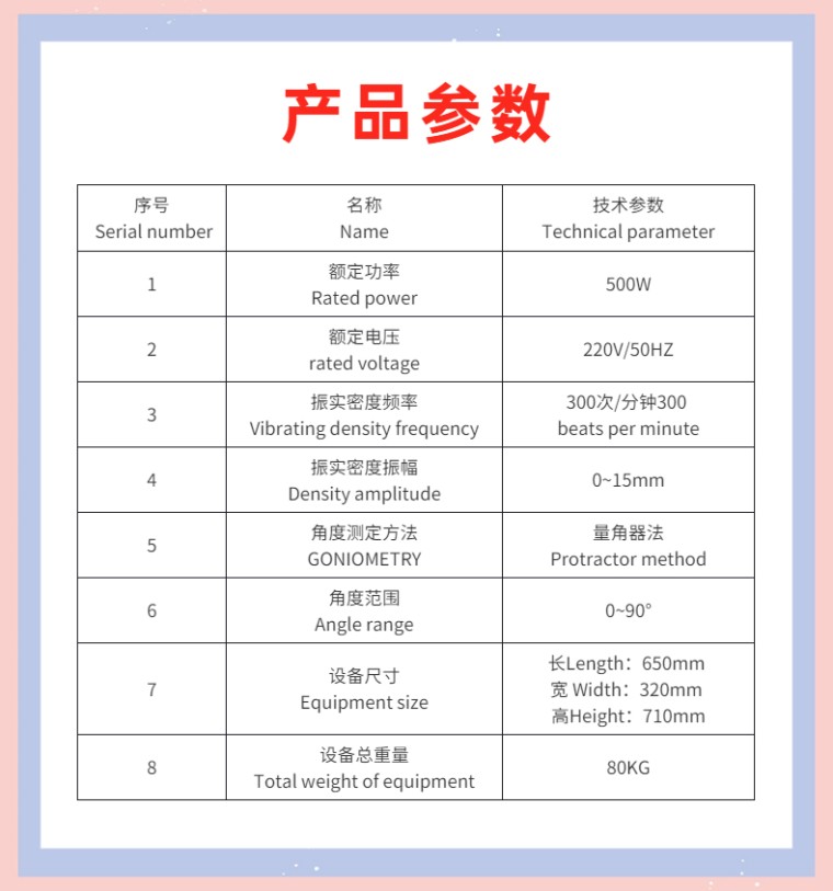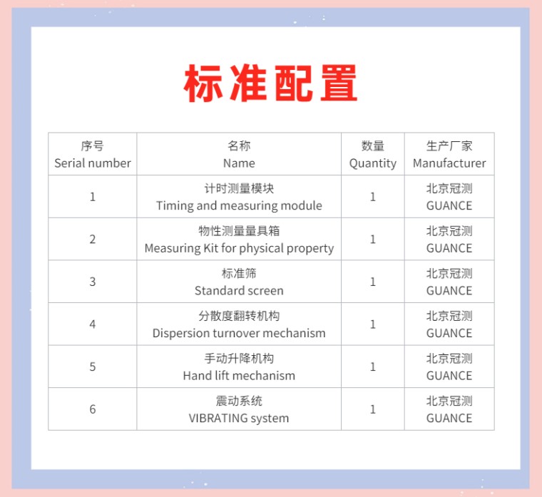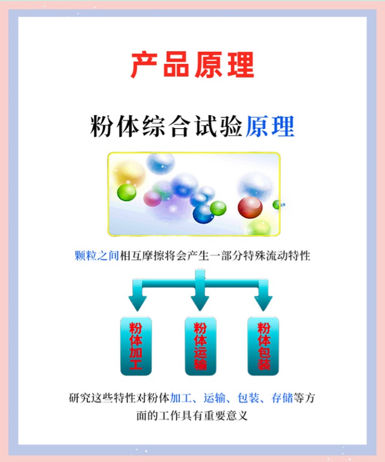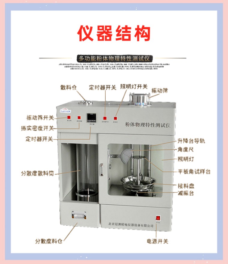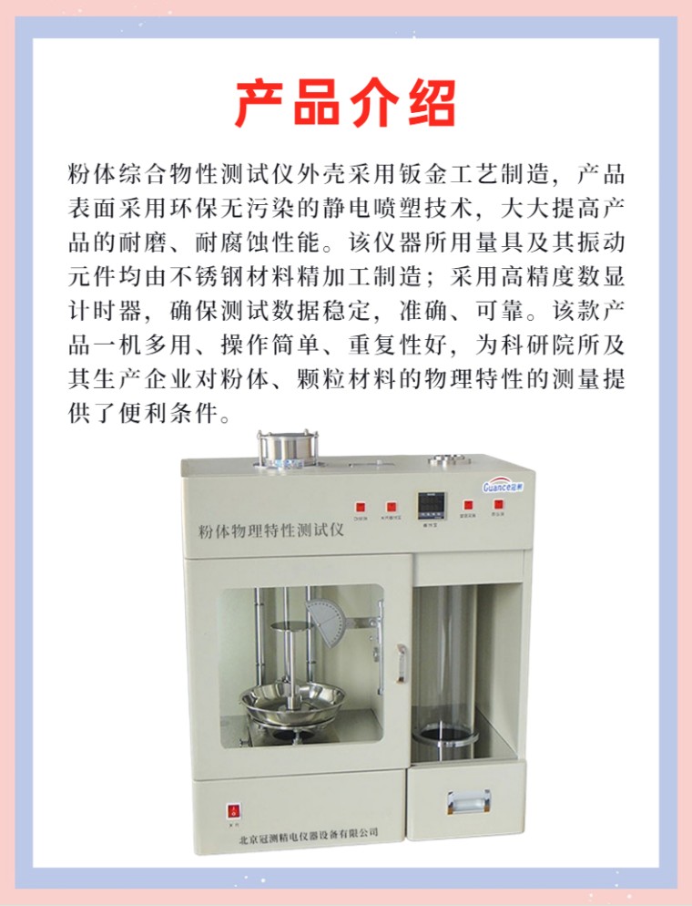 粉体综合物性测试仪 型号:GCFT-1000 一、参考标准: 1、GB/T 31057.2 - 2018; 颗粒材料 物理性能测试 **部分:振实密度的测量 2、GB/T 31057.3 - 2018;颗粒材料 物理性能测试 第三部分:流动性指数的测量 3、ASTM D6393 - 2014;Standard Test Method for Bulk Solids Characterization by Carr Indices 4、YGB/T 16913 - 2008;粉尘物性试验方法 5、GB/T 1479.1 - 2011;金属粉末 松装密度的测定 :漏斗法 6、GB/T 5162 - 2021;金属粉末 振实密度的测定 7、美国药典:USP32-NF27<616> 8、欧洲药典:EP7.0 07/2010:20934 二、产品介绍 : 粉体综合物性测试仪外壳采用钣金工艺制造,产品表面采用环保无污染的静电喷塑技术,大大提高产品的耐磨、耐腐蚀性能。该仪器所用量具及其振动元件均由不锈钢材料精加工制造;采用高精度数显计时器,确保测试数据稳定,准确、可靠。该款产品一机多用、操作简单、重复性好,为科研院所及其生产企业对粉体、颗粒材料的物理特性的测量提供了便利条件。 三、产品用途: 1、该款测试仪可对粉体、颗粒材料的多个物理性质进行测量。其中包括:休止角、崩溃角、平板角、差角、分散度、松装密度、振实密度、压缩度、空隙率、凝集度、均齐度、流动性指数、喷流性指数等参数。 2、该产品所测的项目及其意义: 休止角:在静平衡状态下,粉体堆积斜面与底部水平面所夹锐角叫做休止角。它是通过特定方式使粉体自然下落到特定平台上形成的。休止角大小直接反映粉体的流动,休止角越小,粉体的流动性越好。休止角也称安息角或自然坡度角。 崩溃角:测量休止角时,给堆积的粉体以一定的外力冲击,这时堆积粉体表面就可能产生崩塌现象,崩塌后粉体堆积斜面与底部水平面所夹锐角称为崩溃角。 差角:休止角与崩溃角之差称为差角。差角越大,粉体的流动性越强。 平板角:将埋在自然堆积粉体中的平板向上垂直提起,粉体在平板上的自由表面(斜面)和水平面之间的夹角与受到一定冲击后的夹角的平均值称为平板角。平板角越小,粉体的流动性越强。一般地,平板角大于休止角。平板角也称为抹刀角。 振实密度:振实密度是指一定重量(或体积)的粉体装填在特定容器后,对容器进行一定强度的振动,从而破坏粉体颗粒间的空隙,使颗粒处于紧密状态。这时的粉体密度叫振实密度。 松装密度:松装密度是指粉体在特定容器中处于自然充满状态后的密度。 压缩度:压缩度是指粉体的振实密度与松装密度之差与振实密度之比。压缩度越小,粉体的流动性越好。压缩度也称压缩率。 分散度:分散度就是粉体在空气中的飘散程度。分散度与粉体的分散性、漂浮性和飞溅性有关。如果分散度超过50%,说明该样品具有很强的飞溅倾向。 空隙率:空隙率是指粉体中的空隙占整个粉体体积的百分比。空隙率因粉体的粒子形状、排列结构、粒径等因素的不同而变化。颗粒为球形时,粉体空隙率为40%左右;不规则形状时,粉体空隙率为70-80%或更高。 均齐度:均齐度是粒度分布的D60和D10的比值。 凝集度:在一定时间内,使用标准筛给粉体特定的振动后,称取筛上残留团聚粉的质量。凝集度越大,粉体的流动性越差。凝集度适用于易团聚的细粉或微粉。 流动性指数:流动性指数是休止角、压缩度、平板角、均齐度、凝集度等项指数的加权和。流动性指数与压缩度有关。 喷流性指数:喷流性指数是流动性指数、崩溃角、差角、分散度等项指数的加权和。 四、产品优势: 1、与传统物理性质测试仪相比,该产品一机多用,大大提高空间利用率。 2、该产品可同时满足多个标准,适用场景更广泛。 五、技术参数: 1、额定功率:500W; 2、额定电压:220V/50HZ; 3、振实密度频率:300次/分钟; 4、振实密度振幅:0~15mm; 5、角度测定方法:量角器法; 6、角度范围:0~90°; 7、设备尺寸:长:650mm 、宽 :320mm 、高:710mm; 8、设备总重量:80KG 用户评论 产品评分 目前评分共0人 产品质量