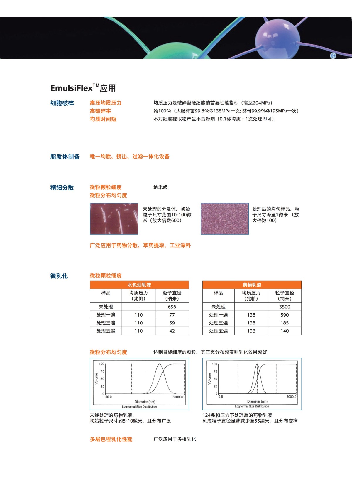 型号:EmulsiFlexC3 产品应用:细胞破碎、脂质体药物、乳剂的研制、悬浊液精细分散、饮料、食品等领域 工作压力:35,000Psi,实际操作压力可达到30,000Psi2070bar● 处理量:3L/h 样品最低处理量:7ml 样品残留:小于1ml 体积:530*460*760毫米