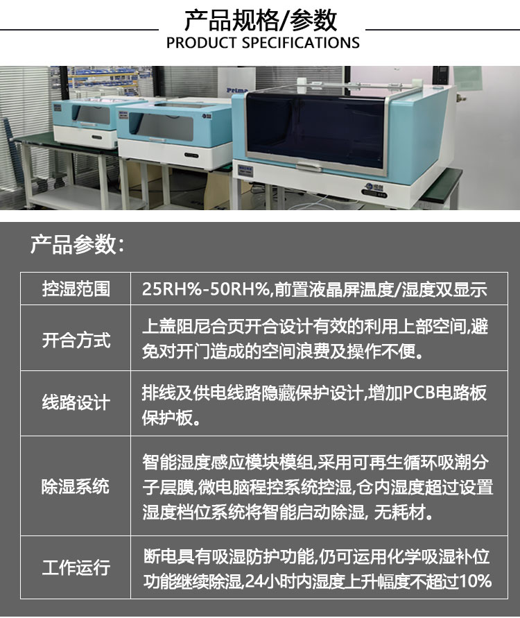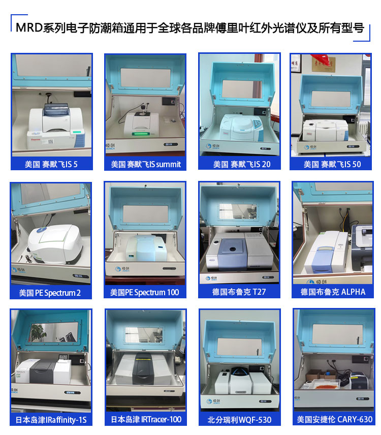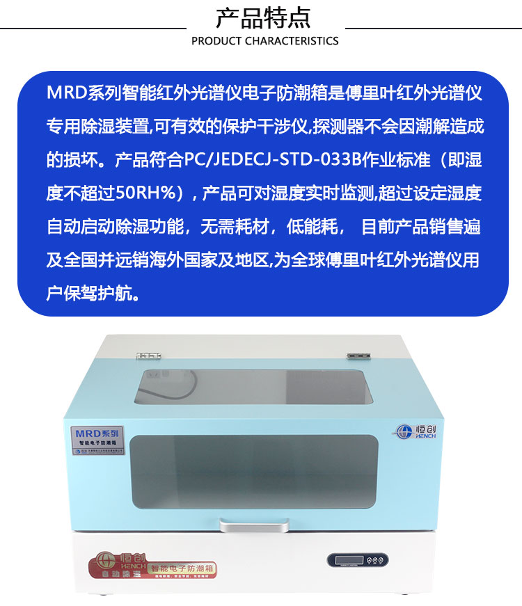 产品介绍 MRD系列智能红外光谱仪电子防潮箱是傅里叶红外光谱仪专用除湿装置可有效的保护 干涉仪,探测器因潮解造成的损坏。产品符合PC/JEDECJ-STD-033B作业标准(即湿 度不超过50RH%)产品可对湿度实时监测,超过设定湿度自动启动除湿功能,无需耗 材,低能耗, 目前产品销售遍及全国并远销海外***及地区,为全球傅里叶红外光谱仪 用户保驾护航。 产品特点: ▲ 控湿范围:25RH%— 50RH%,前置液晶屏 温度/湿度双显示 ▲ 显示范围:0RH% — 100RH%, 精度±3RH。 ▲ 开合方式:上盖阻尼合页开合设计有效的利用上部空间,避免对开门造成的空间浪 费及操作不便。 ▲ 支撑方式:采用液压杆悬停支撑。MRD-400采用液压杆悬停+单 独样品仓开合设计 ▲ 密封方式:气密式方式,仓门和箱体闭合处采用进口富集硅 胶密封条抗氧化仓内密 封效果好。 ▲ 线路设计:排线及供电线路隐藏保护设计,增加PCB电路板保护板。 ▲ 材质结构:防潮箱四周材料选用1.5mm轧钢板,底部采用5mm 特级载重板层表面 防静电阻燃喷涂工艺, 内部接合处固化胶填充确保密封性结构设计,密 封性能好。 ▲ 除湿系统:智能湿度感应模块模组(超强等级),采用可再生循 环吸潮分子层膜,微 电脑程控系统控湿, 仓内湿度超过设置湿度档位系统将智能启动除湿, 无耗 材,延长产品使用寿命。 ▲ 工作运行:断电具有吸湿防护功能, 仍可运用化学吸湿补位功能继续除湿24小时内湿 度上升幅度不超过10%。