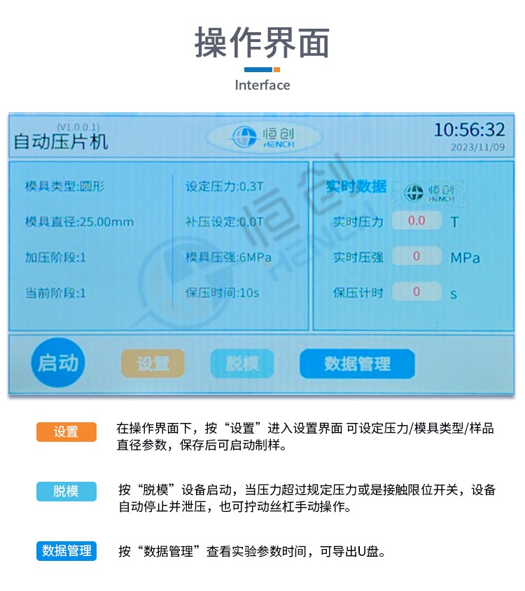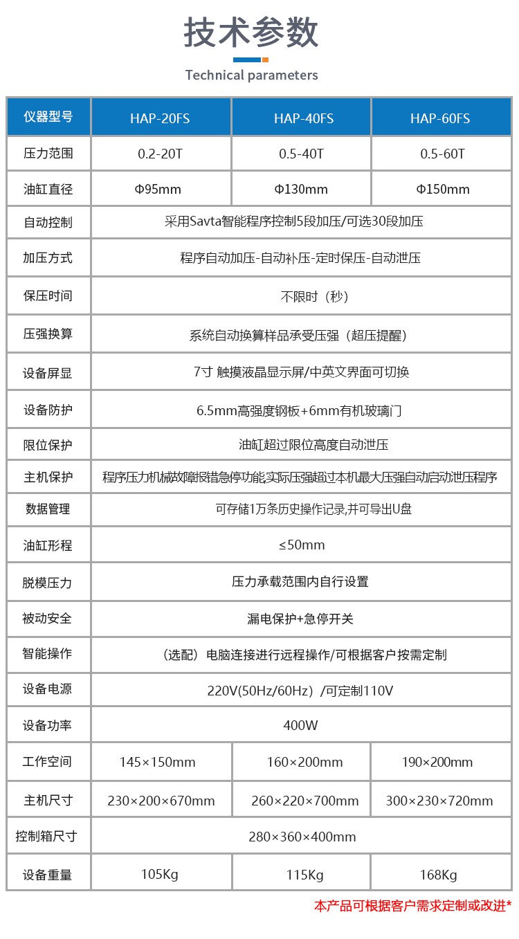 产品介绍 仪器型号:HAP-FS 压力范围:0.2-20T/0.5-40T/0.5-60T 活塞行程:Φ95/130/150mm 加压方式:五段任意设置/自动加压 电源功率:220V/500W 安全防护:急停开关-漏电保护-防护玻璃 工作空间:145*150/160*200/190*200mm 设备重量:102kg/115kg/160kg