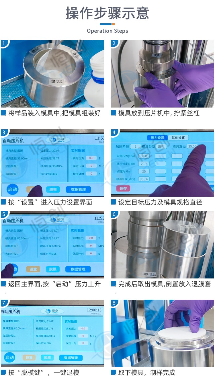 产品介绍 仪器型号 HAP-65FS 压力范围 0.5-65T 油缸直径 Φ165mm 自动控制 采用Savta智能程序控制5段加压/可选配15段加压 加压方式 程序自动加压-自动补压-定时保压-自动泄压 保压时间 不限时(N秒) 压强换算 系统自动换算样品承受压强(超压提醒) 设备屏显 7寸 触摸液晶显示屏/中英文界面可切换 设备防护 6.5mm高强度钢板+6mm有机玻璃防护门 限位保护 油缸超过限位高度自动泄压 主机保护 程序压力,机械压力故障报错急停功能 实际压强超过本机最 大压强自动启动泄压程序 数据管理 可存储1万条历史操作记录,并可导出U盘 油缸行程 ≤50mm 脱模压力 压力承载范围内可自行设置 被动安全 漏电保护+急停开关 智能操作 (选配)电脑连接进行远程操作/可根据客户需求定制 设备电源 220V(50Hz/60Hz)/可定制110V 设备功率 500W 有效空间 220×200×220mm 主机尺寸 330×400×725mm 主机重量 285Kg 控制箱尺寸 260×400×400mm 控制箱重量 66Kg 配置说明 可根据用户需求定制或改进压片机,可选配承压范围内 各类圆形、方形、异形、电池模具等。 补压设定 加压上限、补压值相差最 小0.3T,可根据要求来定制 最 小差值(<0.3T)