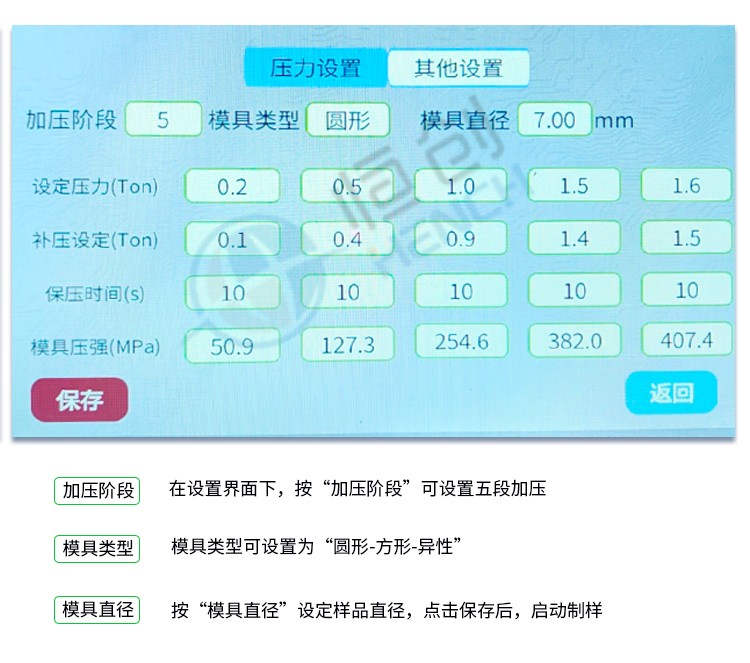 产品介绍 仪器型号 HAP-150FS 压力范围 3-150T 油缸直径 Φ250mm 自动控制 采用Savta智能程序控制5段加压/可选配15段加压 加压方式 程序自动加压-自动补压-定时保压-自动泄压 保压时间 不限时(N秒) 压强换算 系统自动换算样品承受压强(超压提醒) 设备屏显 7寸 触摸液晶显示屏/中英文界面可切换 设备防护 6.5mm高强度钢板+6mm有机玻璃防护门 限位保护 油缸超过限位高度自动泄压 主机保护 程序压力,机械压力故障报错急停功能 实际压强超过本机最 大压强自动启动泄压程序 数据管理 可存储1万条历史操作记录,并可导出U盘 油缸行程 ≤50mm 脱模压力 压力承载范围内可自行设置 被动安全 漏电保护+急停开关 智能操作 (选配)电脑连接进行远程操作/可根据客户需求定制 设备电源 220V(50Hz/60Hz)/可定制110V 设备功率 700W 有效空间 300×300×260mm 主机尺寸 420×600×925mm 主机重量 552Kg 控制箱尺寸 300×480×480mm 控制箱重量 85Kg 配置说明 可根据用户需求定制或改进压片机,可选配承压范围内 各类圆形、方形、异形、电池模具等。 补压设定 加压上限、补压值相差最 小0.3T,可根据要求来定制 最 小差值(<0.3T)