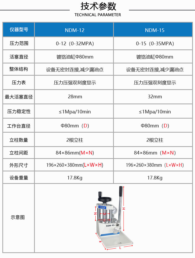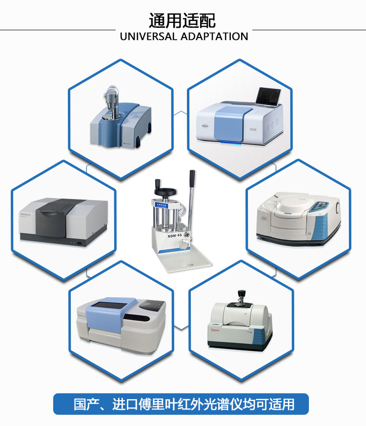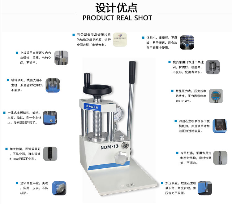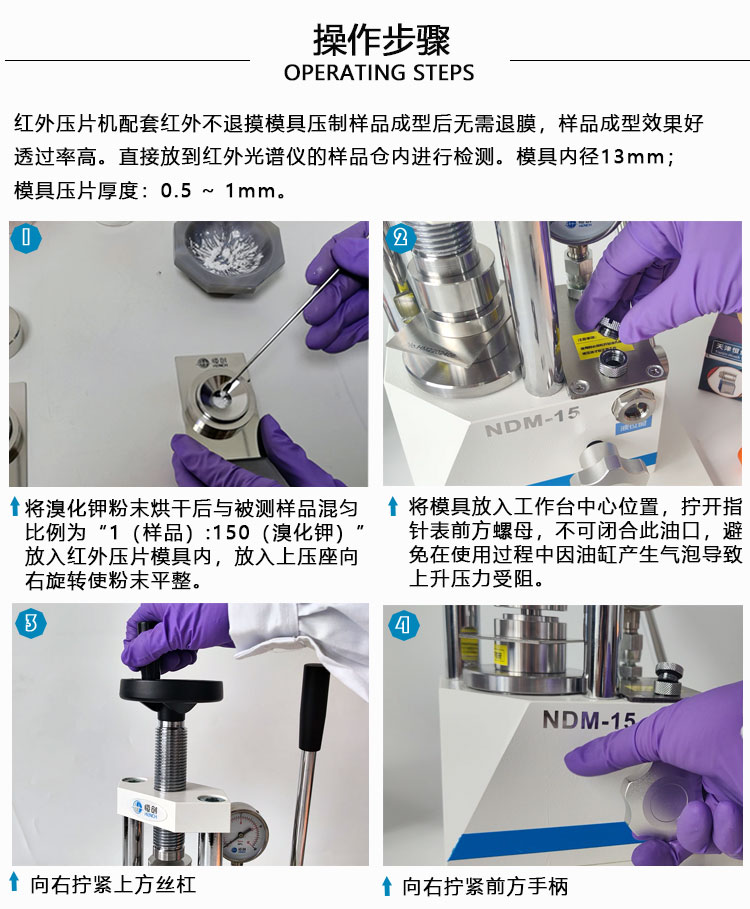 产品介绍 NDM-15红外压片机采用一体式结构,上压速度快,不漏油。 适用于红外光谱仪粉末样品压片,采用进口柱塞更大程度提高 产品的稳定性。可配套7mm,13mm红外压片模具。本产品 可配套所有品牌傅里叶变换红外光谱仪,例如:北分瑞利,天津 港东,美国Thermo,美国PE,德国布鲁克,日本岛津等。