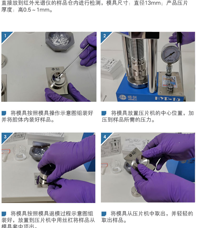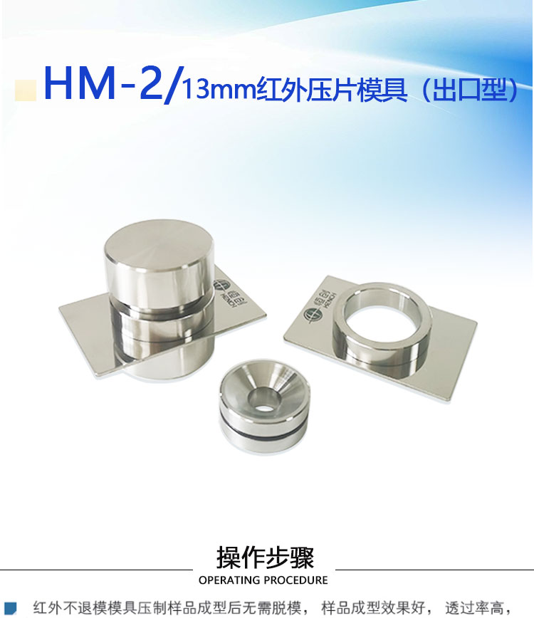 产品介绍 HM-2红外压片模具为傅里叶红外光谱仪固体粉末制样专用模具, 材质选用优质合金工具钢。压片成型度好,无需脱模,操作简便。 本产品可配套所有品牌傅里叶变换红外光谱仪,例如:北分瑞利, 天津港东,美国Thermo,美国PE,德国布鲁克,日本岛津等。
