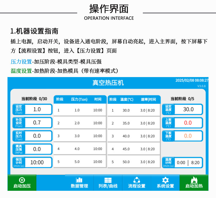 产品介绍 设备型号 VHP-200D 压力范围 0-25T/0.1t 热压板尺寸 200×200mm 加热范围 室温-300℃/0.1℃ 加压方式 自动加压 加压过程 自动加压-自动补压-精准补压-定时泄压 加压段数 30段可任意设置 保压时间 不限时N秒,每段均可设置不同的保压时间 压强换算 实时自动计算样品承受压强(Mpa) 控制面板 7寸 触摸液晶屏 触摸模块 压力/温控/数据管理系统-中英文切换 真空度 -0.095Mpa 温控系统 可编程-30段加热-自动升温/保温 升温速率 可设置每分钟升温/℃ 保温时间 不限时N秒,每段均可设置不同的保压时间 热压板类型 双平板加热、加压,上板固定/抛光面板 加热芯材质 铝芯 设备隔热 进口隔热板 压力安全 程序压力,机械压力故障报错急停功能 当系统压强超过安全值自动泄压+急停开关 高温安全 模具温度超过50℃温控器提示“注意防烫” 设备电源 220V(50Hz/60Hz)带漏电保护 设备功率 3200W(主机2900W+真空泵300W) 设备尺寸 670×670×790mm 设备重量 295Kg 配置说明 按需定制/真空泵可选配