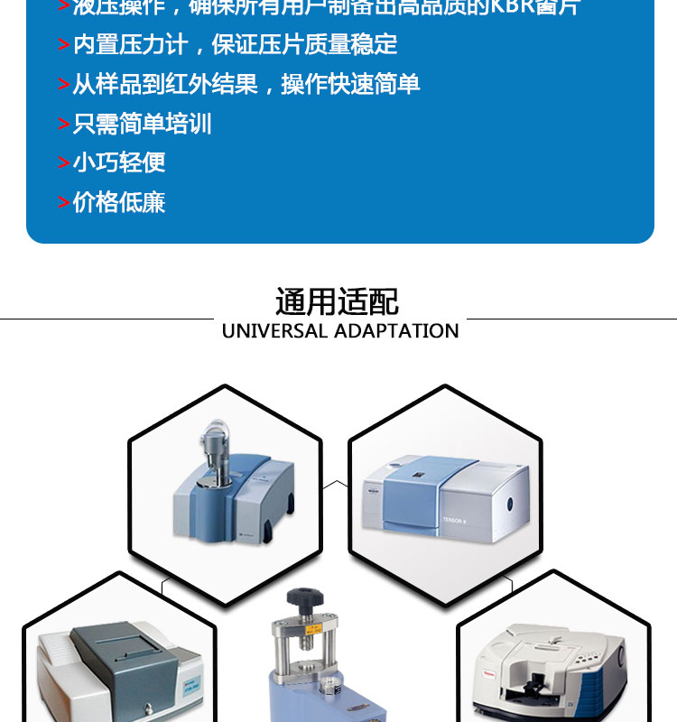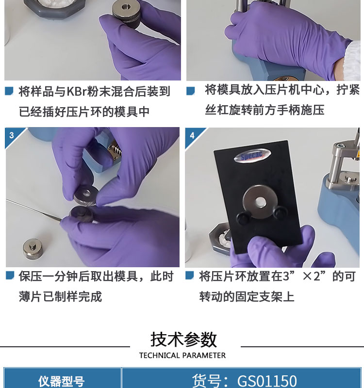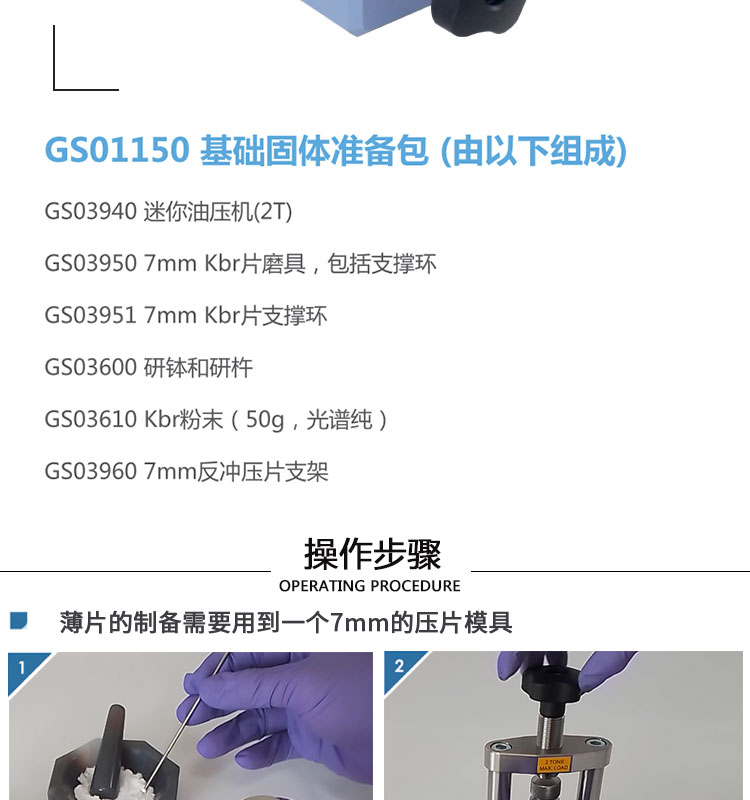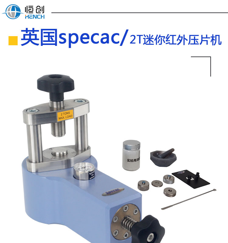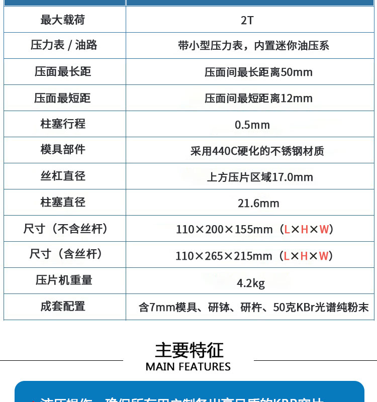 产品介绍 产品参数 压力负荷:2T 压力表/油路:带小型压力表,内置迷你油压系 压面长距:压面间长距离50mm 压面短距:压面间短距离12mm 柱塞行程:0.5mm 模具部件:采用440C硬化的不锈钢材质 丝杠直径:上方压片区域17.0mm 柱塞直径:21.6mm 尺寸(不含丝杠):110×200×155mm(L×H×W) 尺寸(含丝杠):110×265×215mm(L×H×W) 压片机重量:4.2kg 成套配置:含7mm模具、研钵、研杆、50克KBr光谱纯粉末