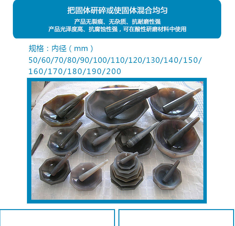 产品介绍 产品信息 名 称:天然玛瑙研钵 级 别: 国内普通型A级系列 颜 色: 天然玛瑙本色 用 途: 实验室样品前处理固体粉末手工研磨器,用于研磨与分析 固体物质或进行粉末状固体的混合。 产品特点 1. 产品无裂痕、无杂质、抗耐磨性强。 2.产品光泽度优质、抗腐蚀性强,可在酸性研磨材料中使用。 3.内径规格:50 / 60 / 70 / 80 / 90 / 100 / 110 / 120 / 130 / 140 / 150 / 160 / 170 / 180 / 190 / 200 mm
