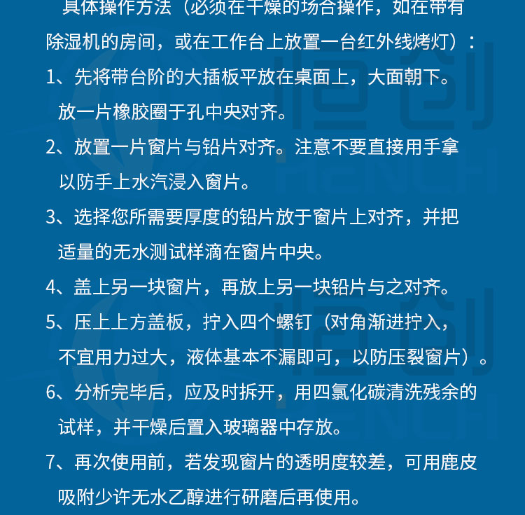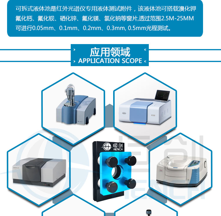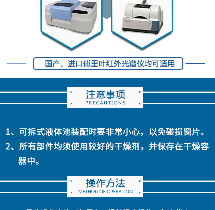 产品介绍 此款固定液体池配套光程有:0.1mm、0.2mm、0.3mm、0.5mmm。适用 于傅里叶红外光谱仪液体样品测试。可配套溴化钾、氟化钙、硒化锌、氯化钠 氯化钾等窗片。本产品通用性强可配套所有品牌傅里叶变换红外光谱仪,例如 北分瑞利,天津港东,美国Thermo,美国PE,德国布鲁克,日本岛津等。