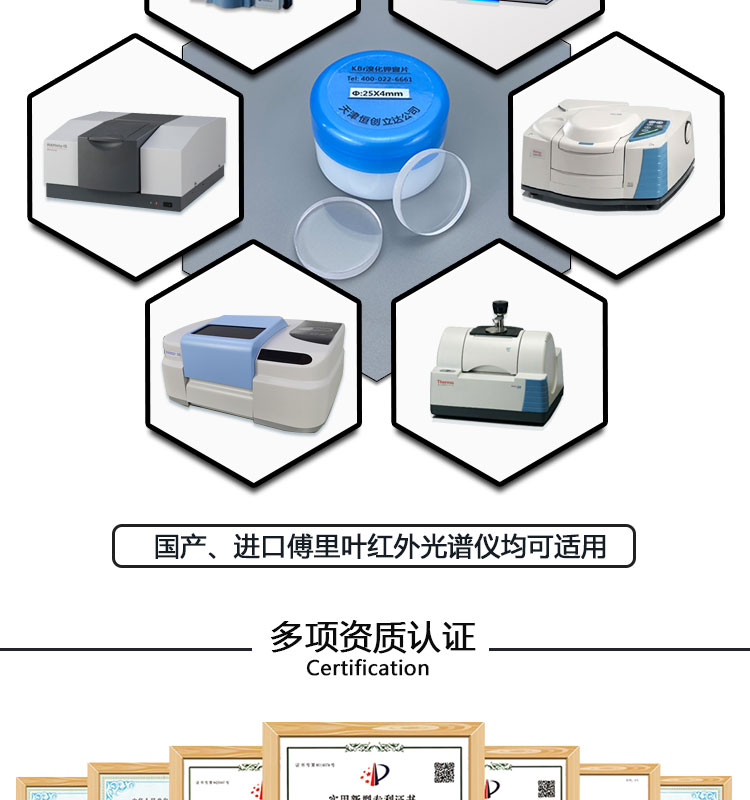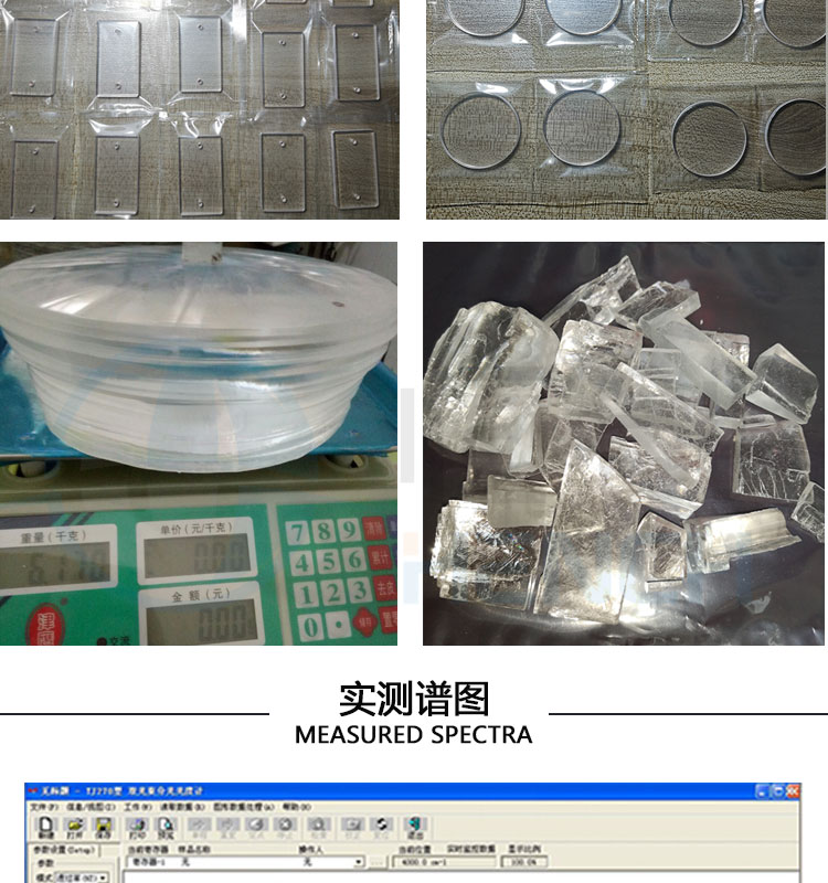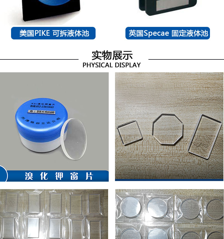产品介绍 产品特点: 符红外光谱用于分析化学中的光谱区段是中红外区,即波7800~350cm-1的 范围内溴化钾(KBr)在中红外区没有吸收,用它来压片测定不会对样品信 号产生干扰. ” 红外光谱中溴化钾光谱纯测固体样品注意事项: 1、纯度,达到光谱纯的级别; 2、干燥,不能含有水.平时要放在干燥器里,及时更换干燥剂 3、溴化钾(KBr)窗片、光谱纯、晶体具有较高的透过率和较宽的透射 波段 4、纯度可达99.99%广泛用于傅里叶变换红外光谱仪,红外分光光度计及红 外装置的分光棱镜,透射窗口和透镜等。 产品规格: 圆形:10×2、13×2、15×3、20×3、25×4、32×3、30×3、32×3 35×5、40×5mm 方形/长方形:30×30×2、40×20×4、50×50×6、100×100×6mm 八角形等 其他尺寸均可定制! 技术参数 1、折射率:nd=1.559,n(10μ)=1.525 2、熔点:730℃ 3、密度:2.75g/cm3 4、莫氏硬度:2级 5、解理面:[100] 6、溶解度:53.5g/100gH2O 7、透光范围:0.2~25μm 8、热膨胀系数:3.76×10-5/℃ 9、导热率:0.0115c/g.℃.cm.s. 10、透过率大于92% 11、易潮解,透过波长50000-400cmˉ1,(0.2~25um)