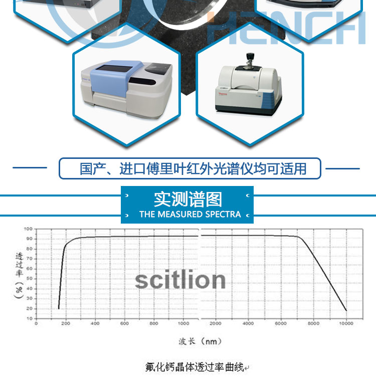 产品介绍 产品特点: 1.符红外光谱用于分析化学中的光谱区段是中红外区,即波7800~350cm-1的范围 2.氟化钙(CaF2)在中红外区没有吸收,用它来压片测定不会对样品信号产生干扰. 3.氟化钙(CaF2)晶体具有透光范围宽(在0.13μm~10μm波长范围内透光性 能良好)应力双折射低(在200nm以上无明显本征双折射),折射率均匀高,机械性能稳 定,不潮解,抗辐照损伤能力强等优点,是制作各类光学窗口、棱镜及透镜等 光学元件的理想材料. 4.目前可以获得的CaF2晶体的最 大直径为375mm。 5.具有较高的透过率和较宽的透射波段,纯度可达99.99%,广泛用于傅里叶变 换红外光谱仪、红外分光光度计等。 产品规格: 圆形:10×2、13×2、15×3、20×3、25×4、32×3、30×3、32×3、 35×5、40×5mm 可根据客户要求定制不同规格尺寸 产品参数: 折射率(0.13μm~10μm):1.6921~1.3161 熔点/℃:1360 解理面 :(111) 热导率/Wm-1K-1:9.71 克氏硬度/kg*mm-2:158.3 弹性系数:C11=164;C12=53;C44=33.7 溶解度/ g/100gH2O:0.0017@20℃