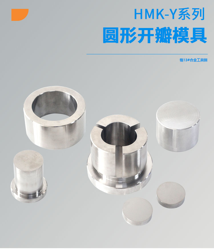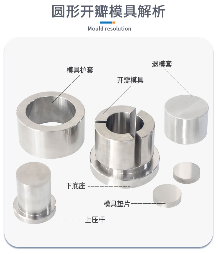 圆形开瓣模具采用进口高速工具钢,表面光滑度高,硬度强。适用于材料科学研究