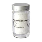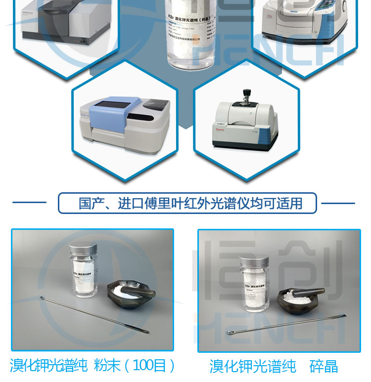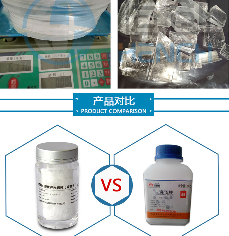 产品介绍 我公司生产的溴化钾(KBr)光谱纯、晶体具有较高的透过率和较宽的透射 波段,纯度可达99.99%,广泛用于傅里叶变换红外光谱仪,红外分光光度计 及红外装置的分光棱镜,透射窗口和透镜等 产品特点: 符红外光谱用于分析化学中的光谱区段是中红外区,即波4000~400cm-1的范围内. 溴化钾(KBr)在中红外区没有吸收,用它来压片测定不会对样品信号产生干扰. ” 红外光谱中溴化钾光谱纯测固体样品注意事项: 1、纯度,达到光谱纯的级别 2、干燥,不能含有水.平时要放在干燥器里,及时更换干燥剂 3、压片时在红外灯下操作,也是避免吸收水份 技术参数 1、折射率:nd=1.559,n(10μ)=1.525 2、熔点:730℃ 3、密度:2.75g/cm3 4、莫氏硬度:2级 5、解理面:[100] 6、溶解度:53.5g/100gH2O 7、透光范围:0.2~25μm 8、热膨胀系数:3.76×10-5/℃ 9、导热率:0.0115c/g.℃.cm.s. 10、透过率大于92% 11、易潮解,透过波长50000-400cmˉ1,(0.2~25um)