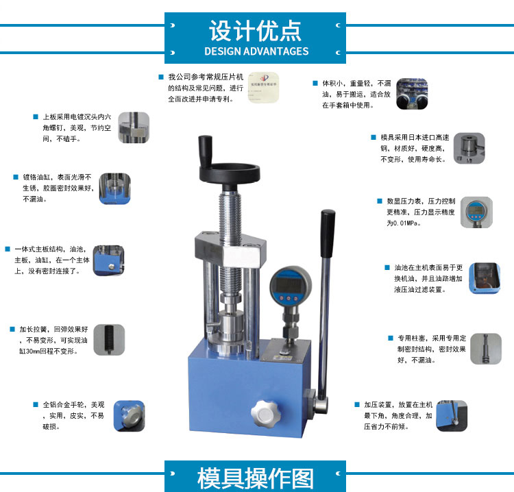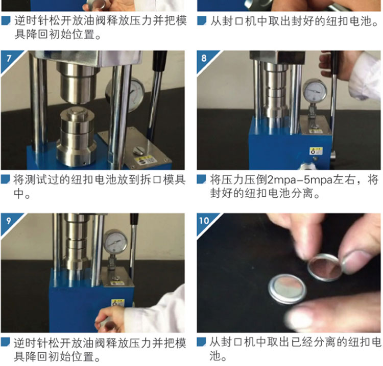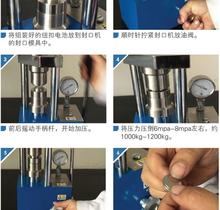 产品介绍 小型纽扣电池封口机,体积小重量轻,可放入手套箱操作。 适用于CR16、CR20、CR24、CR30电池壳使用。 仪器型号 YP-2N 压力表显 指针表,压力压强双显示 压力范围 0-2T(24.37Mpa) 活塞直径 Φ45mm 封口模具 标配CR20系列封口模具(可选配CR16/24/30) 封口压力 0.8~1.2T 拆口模具 可选配CR16/20/24/30系列封口模具 拆口压力 ≤0.4T 整体结构 手动液压制式,锻造工艺,一体式结构(搭载68号耐磨液压油) 立柱数量 2根 压力稳定性 ≤1Mpa/10min 外形尺寸 225×155×320mm 设备重量 28Kg 配置说明 直径≤Φ13的封口时,内面的填充电芯要比壳内空间≥0.2-0.3mm