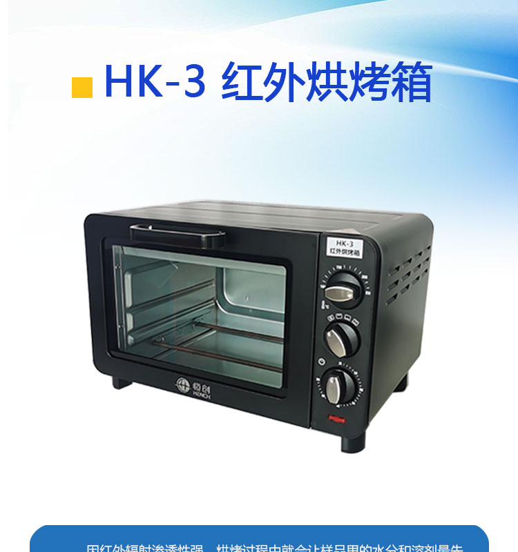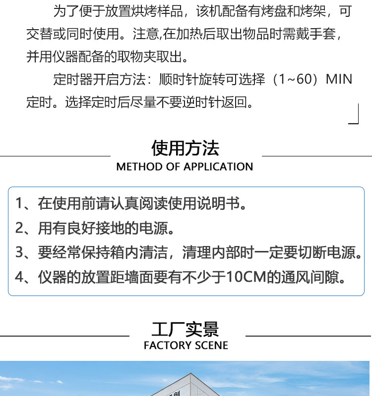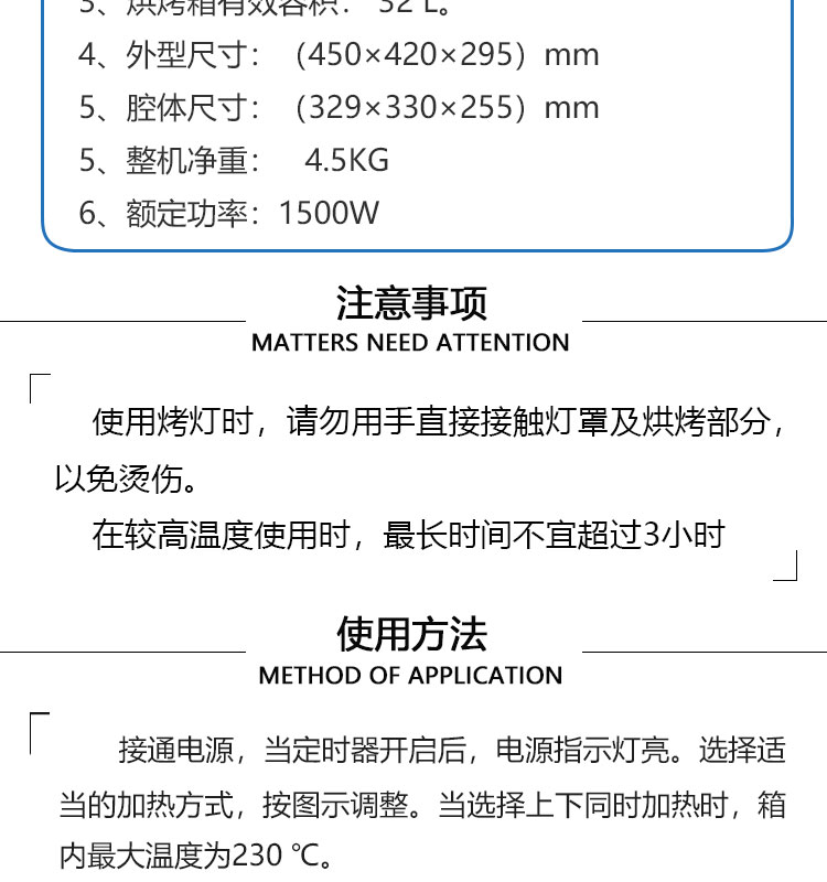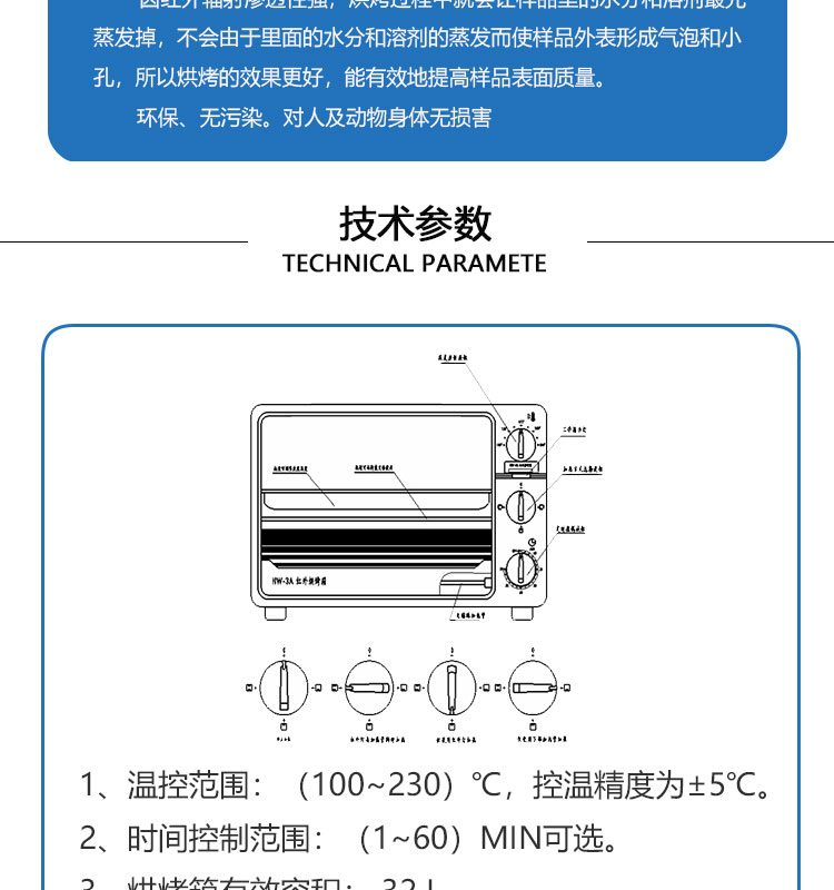 产品介绍 主要技术指标 1、 温控范围:(100~230)℃,控温精度为±5℃。 2、 时间控制范围:(1~60)MIN可选。 3、 烘烤箱有效容积: 32 L。 4、 外型尺寸:(450×420×295)mm 5、 腔体尺寸:(329×330×255)mm 5、 整机净重: 4.5KG 6、 额定功率: 1500W