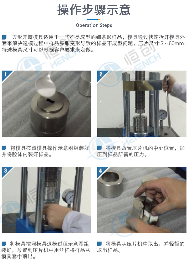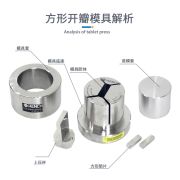 产品介绍 方形 / 长方形开瓣模具采用进口高速工具钢,表面光滑度高,硬度强。适用于材料科学 研究、催化实验、陶瓷烧结实验,水泥建材、药品研发制样等行业。可根据客户需求定 制不同尺寸的压片模具。