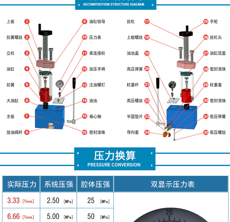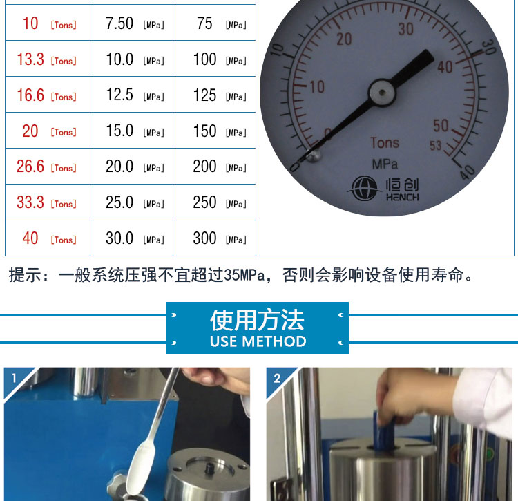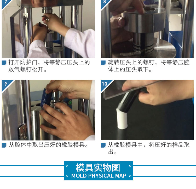产品介绍 等静压压片机适合对样品成型均匀度要求比较严格的用户,可压制 一些钢模无法成型的样品。广泛应用于粉末冶金,符合材料,耐火 材料,陶瓷,硬质合金的成型。 仪器型号 YP-40J/S 压力范围 0-40T(31Mpa) 压力换算 1Mpa=1.36t 活塞直径 Φ130mm 活塞行程 ≤50mm 腔体尺寸 40×150mm 腔体材质 3铬#13模具钢 最 大压强 ≤300Mpa(可定制500Mpa) 压力表 指针表(双刻度显示)/选配数显表(精度0.01Mpa) 设备防护 侧开5mm高强度有机玻璃防护门 平移卡扣门锁安全便捷 加压方式 手动加压/手动缓加压 环境温度 9℃-42℃ 泄压方式 手动泄压 外形尺寸 355×215×715mm 设备重量 133Kg 配置说明 可选配数显表,也可根据客户尺寸定制等静压机 或橡胶模具