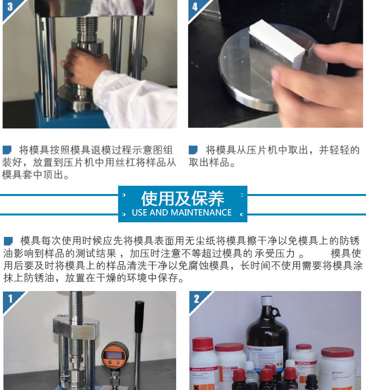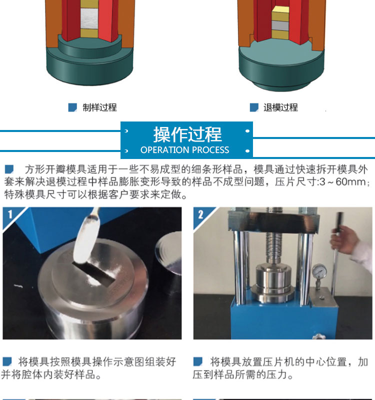 产品介绍 方形 / 长方形开瓣模具采用进口高速工具钢,表面光滑度高,硬度强。适用于材料科学 研究、催化实验、陶瓷烧结实验,水泥建材、药品研发制样等行业。可根据客户需求定 制不同尺寸的压片模具。