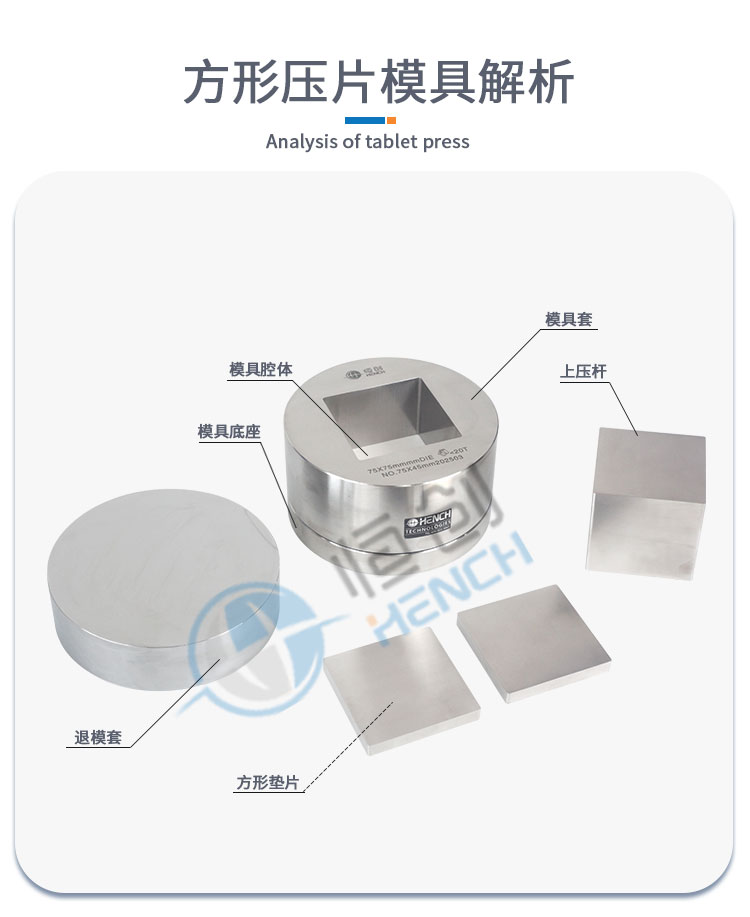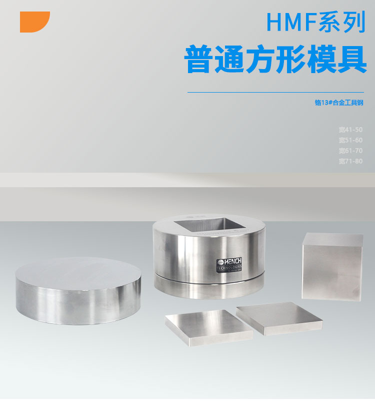 产品介绍 此款方形/长方形模具采用合金工具钢,表面光滑度高,硬度强。适用于材料 科学研究、催化实验、陶瓷烧结实验,水泥建材、药品研发制样等行业。可根 据客户需求定制不同尺寸的方形压片模具。