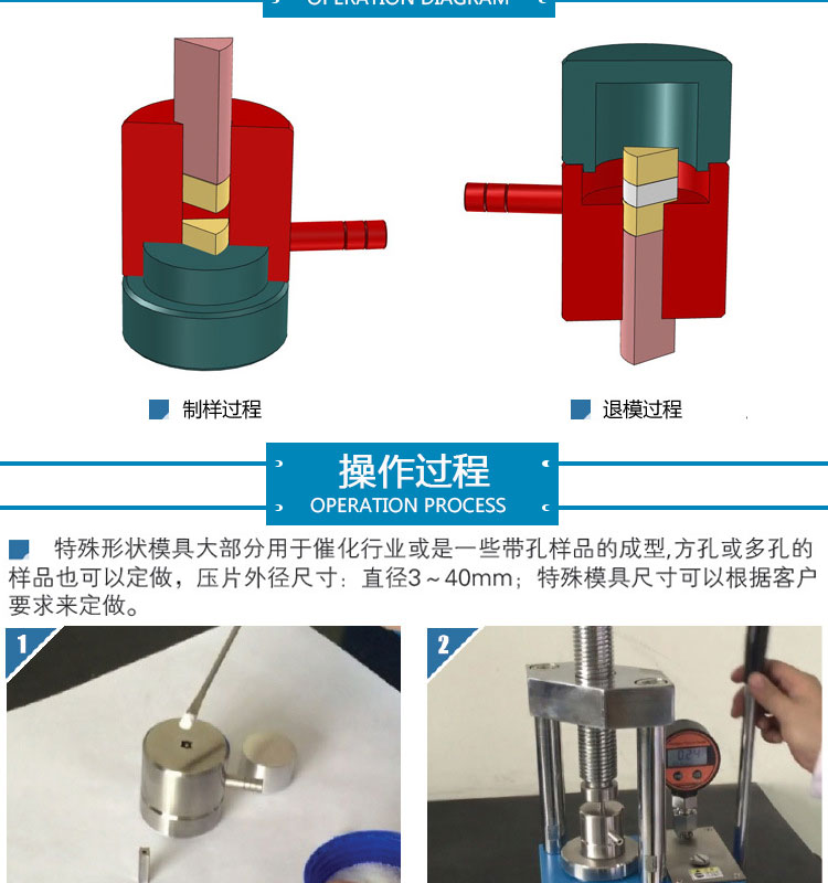 特殊模具采用进口高速工具钢,表面光滑度高,硬度强。适用于材料科学研究