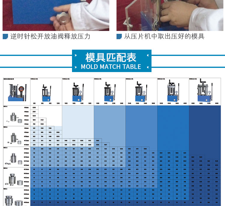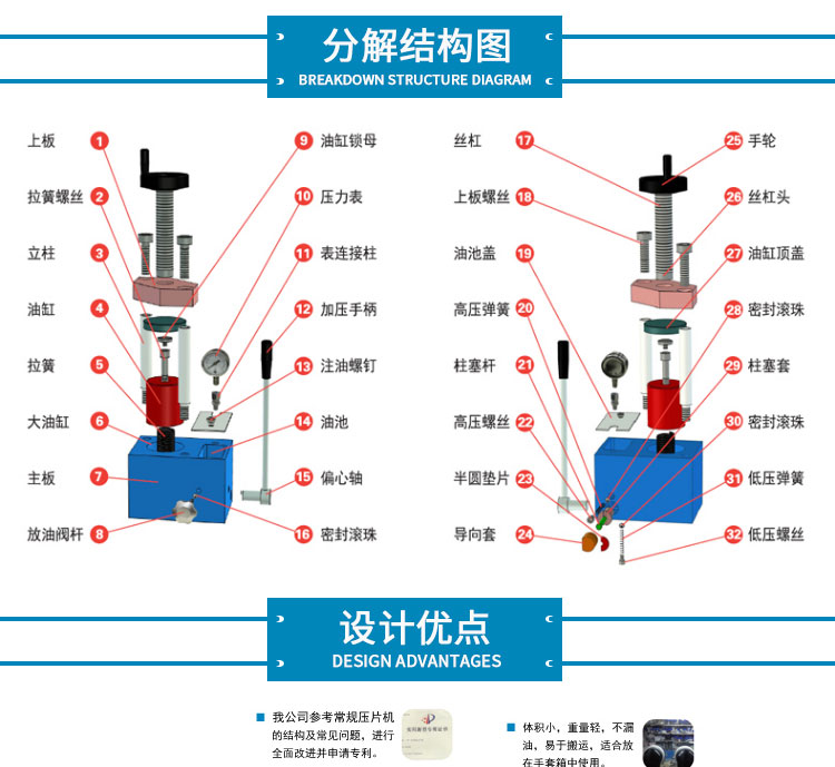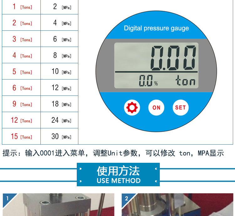 产品介绍 采用一体式结构,不掉压力、不漏油。适用于材料科学研究、催化实验 陶瓷烧结实验,水泥建材、药品研发制样等行业。 仪器型号 YP-15FS 压力范围 0-15T(0-31Mpa) 油缸直径 80mm 压力换算 1Mpa=0.5T 压力表 DDNT高精度数字传感显示表,吨位显示(T)可切换兆帕 (Mpa) 精度0.01T 活塞行程 30mm 设备防护 侧开5mm有机玻璃防护门,平移卡扣门锁安全便捷 压力稳定性 ≤1Mpa/10min 工作台直径 Φ90mm 立柱数量 4根 有效空间 80×80×150mm 外形尺寸 260×175×400mm 设备重量 43Kg 整体结构 手动液压制式,锻造工艺,一体式结构(搭载68号耐磨液压油) 配置说明 根据客户需求加高立柱,可选配承压范围内各类圆形,方形,异形, 电池模具等