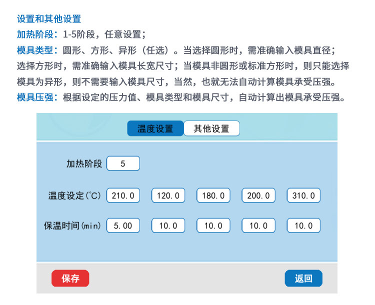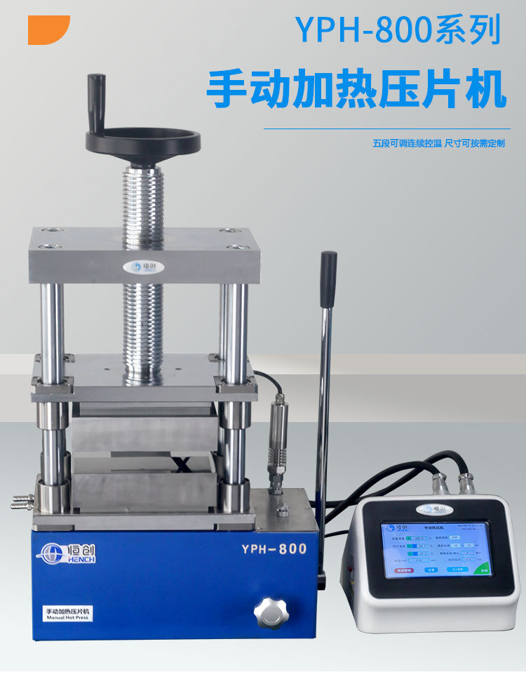 产品介绍 手动加热压片机采用PLC程序控温,工作台面100-400mm可选,温度 分为300℃和500℃。本品适用于聚合物材料、橡胶、塑料、皮革、纺 织等热压成膜研究实验。 仪器型号 YPH-800D1/D2/YPH-800DG1/DG2 压力范围 0-30T 活塞直径 110mm 油缸行程 50mm 控温方式 5段可调连续/分段控温-自动升温-自动保温-自然降温 加热范围 300℃/500℃ 模具尺寸 180×180mm/200×200mm 有效空间 200×140mm 控压控温 0.1T/0.1℃(可定制自行设置精度) 保压时间 不限时(手动泄压) 显示方式 7寸液晶触摸屏/中英文界面可切换 压强换算 PCB控制程序自动换算显示样品所承受压强(Mpa) 加热板类型 四柱定位隔热设计,上下板加热 上板丝杠悬吊设计电镀抛光面板 加热芯材质 300℃(铝芯)/500℃(铜芯) 隔热方式 进口云母隔热板 降温方式 500℃标配水冷机 安全配置 模具温度超过50℃,温控器自动提示“注意防烫” 设备电源 220V(50Hz/60Hz)/可选配110V 设备功率 1800W 主机尺寸 450×260×725mm 温控器尺寸 230×270×180mm 设备重量 190Kg 配置说明 可根据客户需求定制控制面板尺寸加宽,立柱加高 温控器可选配远程控制