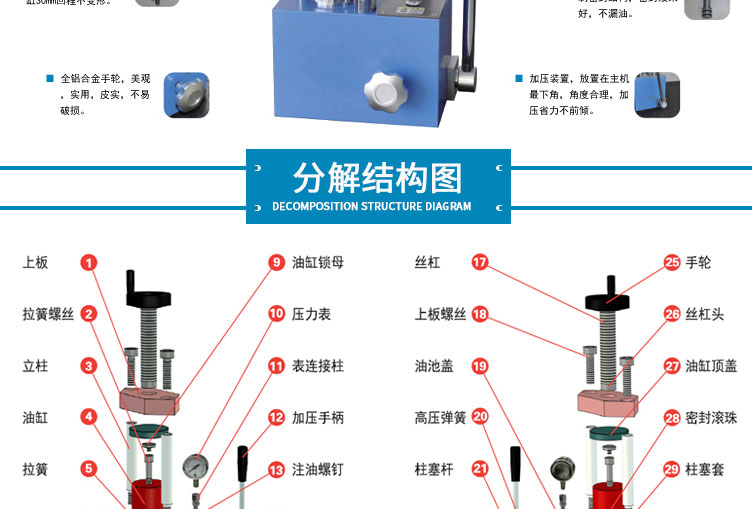 产品介绍 采用一体式结构,不掉压力,不漏油。适用于材料科学研究、催化实验 陶瓷烧结实验,水泥建材、药品研发制样等行业 仪器型号 YP-2S 压力范围 0-2T(0-25.5Mpa) 油缸直径 32mm 压力换算 1Mpa=0.05T 压力表 DDNT高精度数字传感,吨位显示(T)可切换 兆帕(Mpa),精度0.01T 活塞行程 30mm 压力稳定性 ≤1Mpa/10min 工作台直径 Φ50mm 立柱数量 2根 有效空间 90×120mm 外形尺寸 210×170×375mm 设备重量 11.5Kg 整体结构 手动液压制式,锻造工艺,一体式结构 (搭载68号耐磨液压油) 配置说明 根据客户需求加高立柱,可选配承压范围内各类圆形 方形,异形,电池模具等。