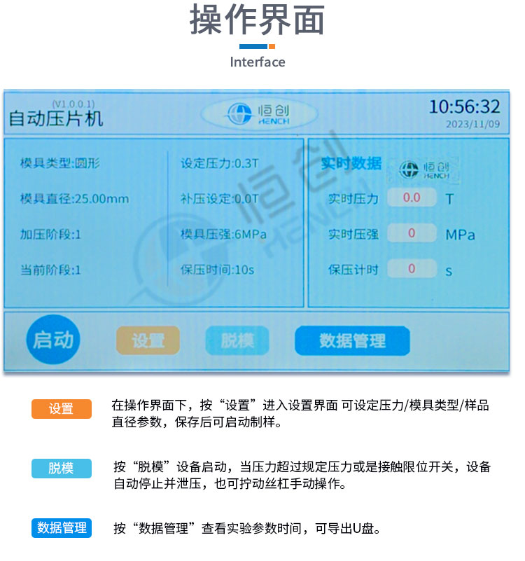 产品介绍 自动等静压压片机适合对样品成型均匀度要求比较严格的用户,可压制 一些钢模无法成型的样品,采用程序加压、保压、泄压方式,制样速度快 精度高,广泛应用于粉末冶金,复合材料,耐火材料,陶瓷硬度合金的成型。 仪器型号 HAP-60J 压力范围 1-60T 腔体承受压强 ≤300Mpa/60T 油缸直径 Φ150mm 油缸行程 ≤50mm 腔体尺寸 Φ50×150mm 腔体材质 3铬13# 模具钢 整体结构 锻造工艺,一体式(搭载68号耐磨液压油)上板摇臂结构 操作便捷 最 大压强 ≤300Mpa(可定制500Mpa) 加压方式 电动加压 加压过程 程序自动加压-自动补压-定时保压-自动泄压 加压段数 5段加压任意设置 保压时间 不限时(N秒)每段可设置不同的保压时间 显示方式 7寸触摸液晶屏/中英文界面可切换 设置方式 触摸直接修改设定数值(方便、快捷) 压强换算 程序自动换算/并直接显示样品所承受压强(Mpa) 限位保护 油缸超过限位高度自动泄压 设备防护 10mm高强度氧化铝板+6mm有机玻璃防护门 主动安全 程序压力,机械压力故障报错急停功能 实际压强超过本机最 大压强自动启动泄压程序 被动安全 漏电保护+急停开关+钢板防护+有机玻璃防护 数据管理 可存储1万条历史操作记录,并可导出U盘 智能操作 电脑连接进行远程操作(选配)/可根据客户需求定制 设备功率 500W 设备电源 220V(50Hz/60Hz)/可定制110V 设备尺寸 300×500×685mm 设备重量 243Kg 配置说明 可根据需求定制改进等静压机或橡胶模具