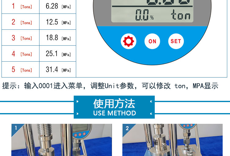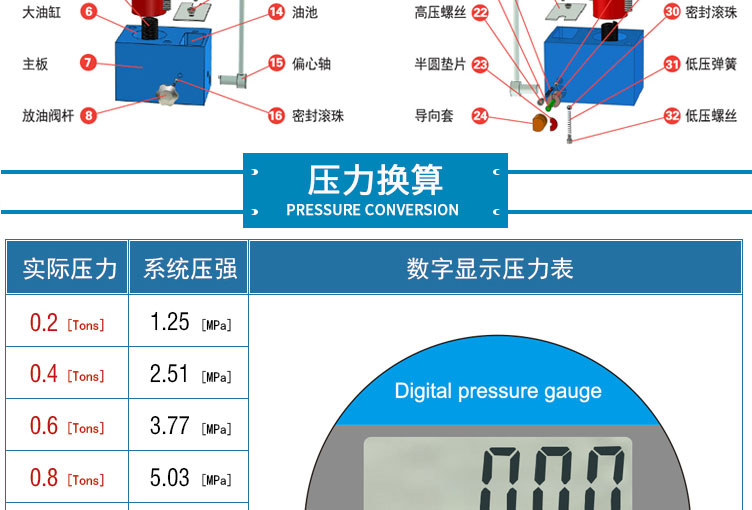 产品介绍 采用一体式结构,不掉压力,不漏油。适用于材料科学研究、催化实验 陶瓷烧结实验,水泥建材、药品研发制样等行业 仪器型号 YP-5S 压力范围 0-5T(0-32Mpa) 油缸直径 47mm 压力换算 1Mpa=0.16T 压力表 DDNT高精度数字传感,吨位显示(T)可切换 兆帕(Mpa),精度0.01T 活塞行程 30mm 压力稳定性 ≤1Mpa/10min 工作台直径 Φ80mm 立柱数量 2根 有效空间 96×130mm 外形尺寸 225×155×385mm 设备重量 28Kg 整体结构 手动液压制式,锻造工艺,一体式结构 (搭载68号耐磨液压油) 配置说明 根据客户需求加高立柱,可选配承压范围内各类圆形 方形,异形,电池模具等。