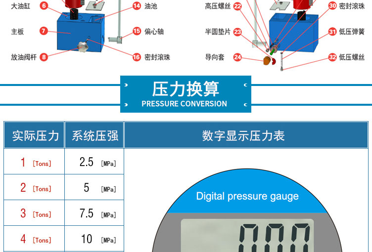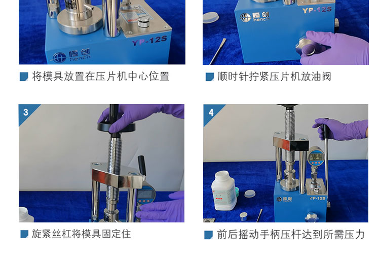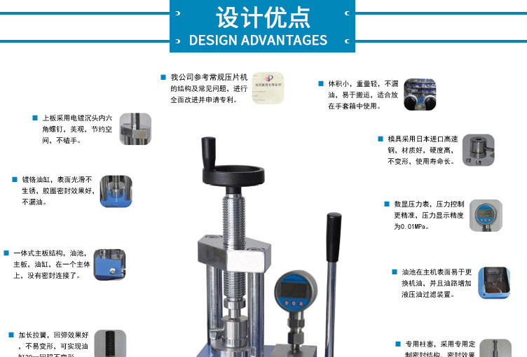 产品介绍 采用一体式结构,不掉压力,不漏油。适用于材料科学研究、催化实验 陶瓷烧结实验,水泥建材、药品研发制样等行业 仪器型号 YP-12S 压力范围 0-12T(0-32Mpa) 油缸直径 70mm 压力换算 1Mpa=0.4T 压力表 DDNT高精度数字传感,吨位显示(T)可切换 兆帕(Mpa),精度0.01T 活塞行程 30mm 压力稳定性 ≤1Mpa/10min 工作台直径 Φ80mm 立柱数量 2根 有效空间 95×130mm 外形尺寸 225×155×385mm 设备重量 28Kg 整体结构 手动液压制式,锻造工艺,一体式结构 (搭载68号耐磨液压油) 配置说明 根据客户需求加高立柱,可选配承压范围内各类圆形 方形,异形,电池模具等。