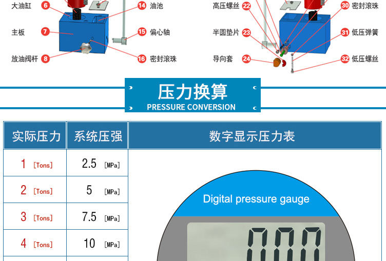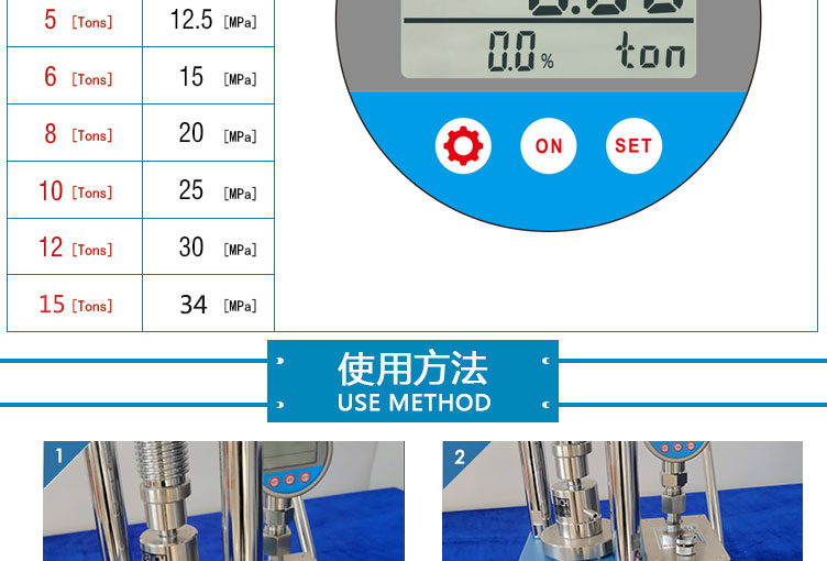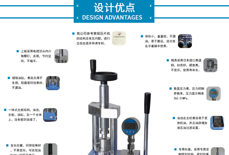 产品介绍 采用一体式结构,不掉压力,不漏油。适用于材料科学研究、催化实验 陶瓷烧结实验,水泥建材、药品研发制样等行业 仪器型号 YP-15S 压力范围 0-15T(0-33Mpa) 油缸直径 75mm 压力换算 1Mpa=0.5T 压力表 DDNT高精度数字传感,吨位显示(T)可切换 兆帕(Mpa),精度0.01T 活塞行程 32mm 压力稳定性 ≤1Mpa/10min 工作台直径 Φ80mm 立柱数量 2根 有效空间 95×130mm 外形尺寸 230×160×385mm 设备重量 28Kg 整体结构 手动液压制式,锻造工艺,一体式结构 (搭载68号耐磨液压油) 配置说明 根据客户需求加高立柱,可选配承压范围内各类圆形 方形,异形,电池模具等。