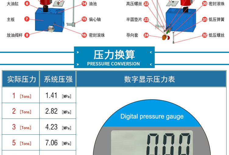 产品介绍 采用一体式结构,不掉压力,不漏油。适用于材料科学研究、催化实验 陶瓷烧结实验,水泥建材、药品研发制样等行业 仪器型号 YP-24S 压力范围 0-24T(0-34.5Mpa) 油缸直径 95mm 压力换算 1Mpa=0.7T 压力表 DDNT高精度数字传感,吨位显示(T)可切换 兆帕(Mpa),精度0.01T 活塞行程 30mm 压力稳定性 ≤1Mpa/10min 工作台直径 Φ105mm 立柱数量 4根 有效空间 80×80×150mm 外形尺寸 250×180×425mm 设备重量 42.5Kg 整体结构 手动液压制式,锻造工艺,一体式结构 (搭载68号耐磨液压油) 配置说明 根据客户需求加高立柱,可选配承压范围内各类圆形 方形,异形,电池模具等。